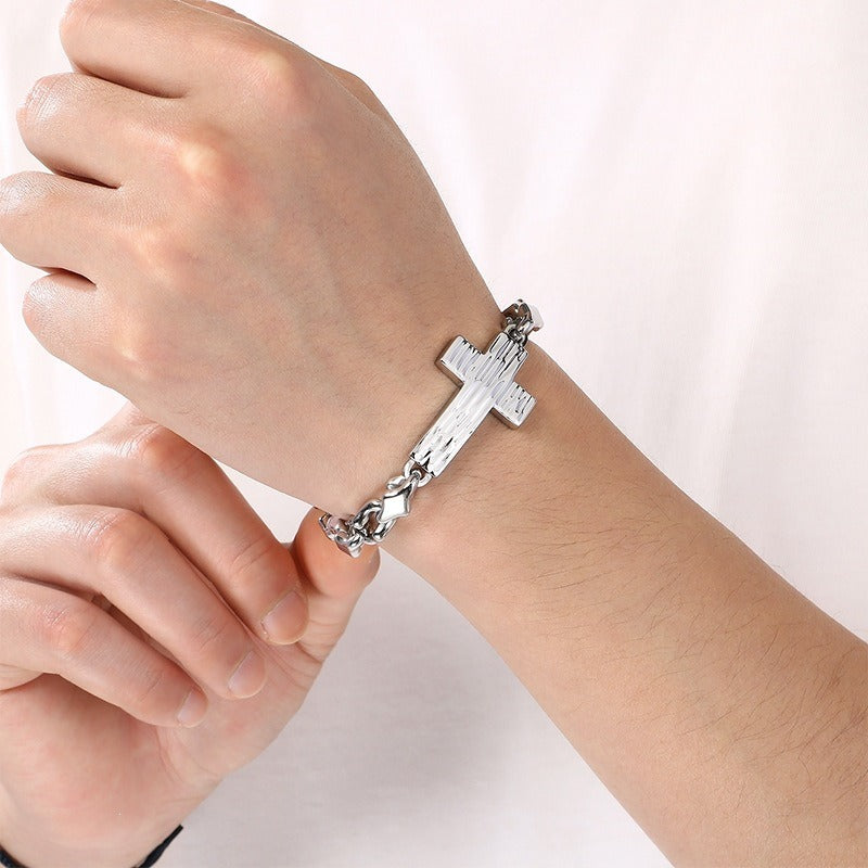 It rests naturally on your wrist, the cross holding the center while the hammered surface softens the shine, giving it a calm, balanced look that feels easy to keep on.