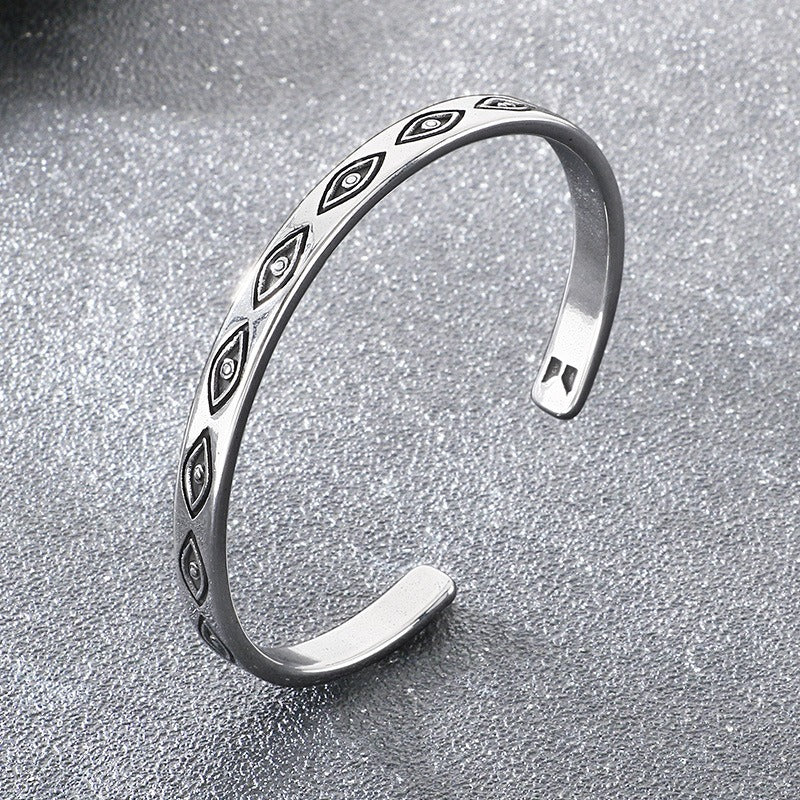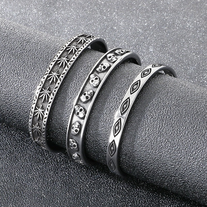 Wear this men’s titanium steel dark metal cuff bracelet with engraved eye and relief head details. The open C shape, balanced width, and calm weight create a steady, controlled presence for daily wear.