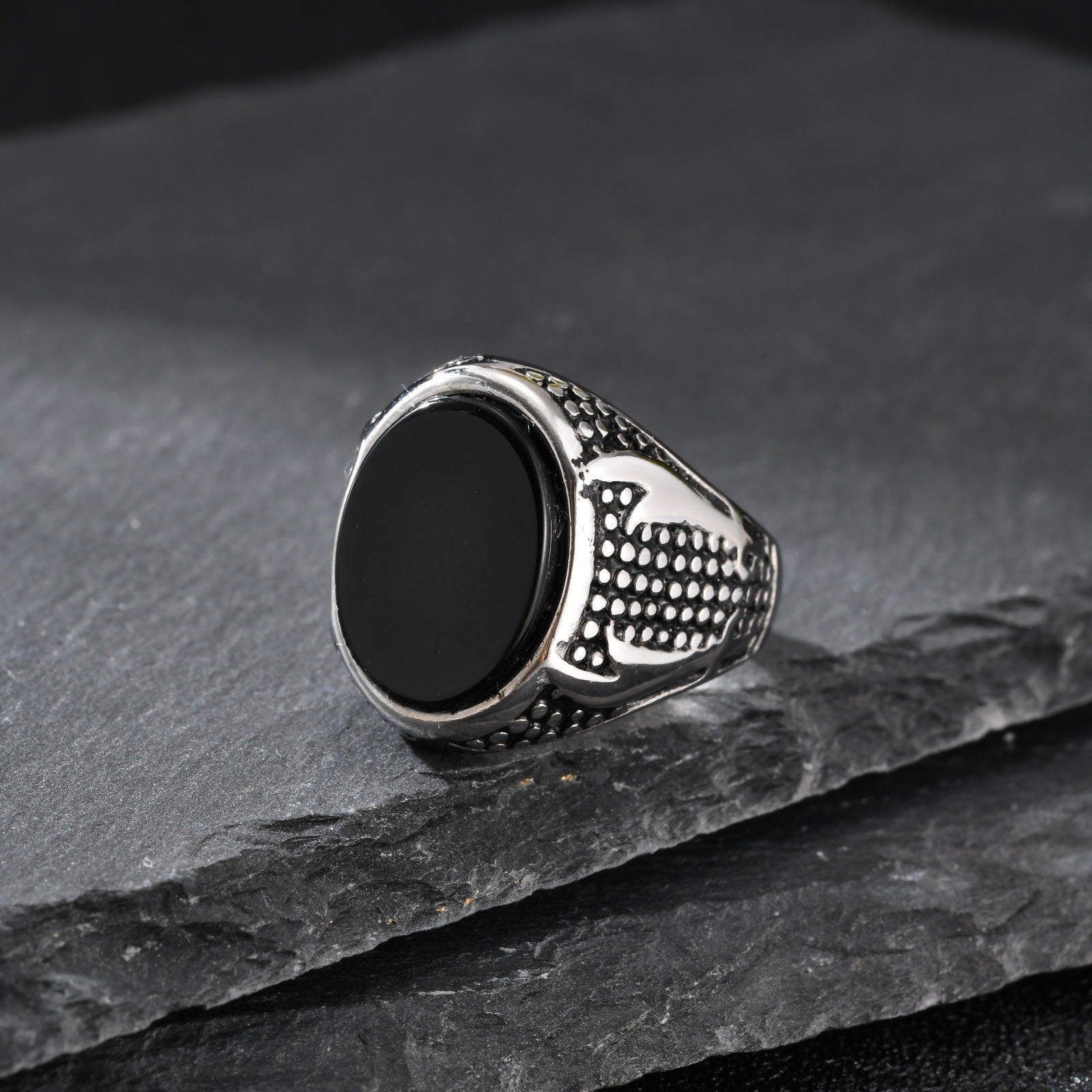 Kemstone Double Sword Black Stone Signet Ring for Men – Stainless Steel Vintage Relief RC-1028
