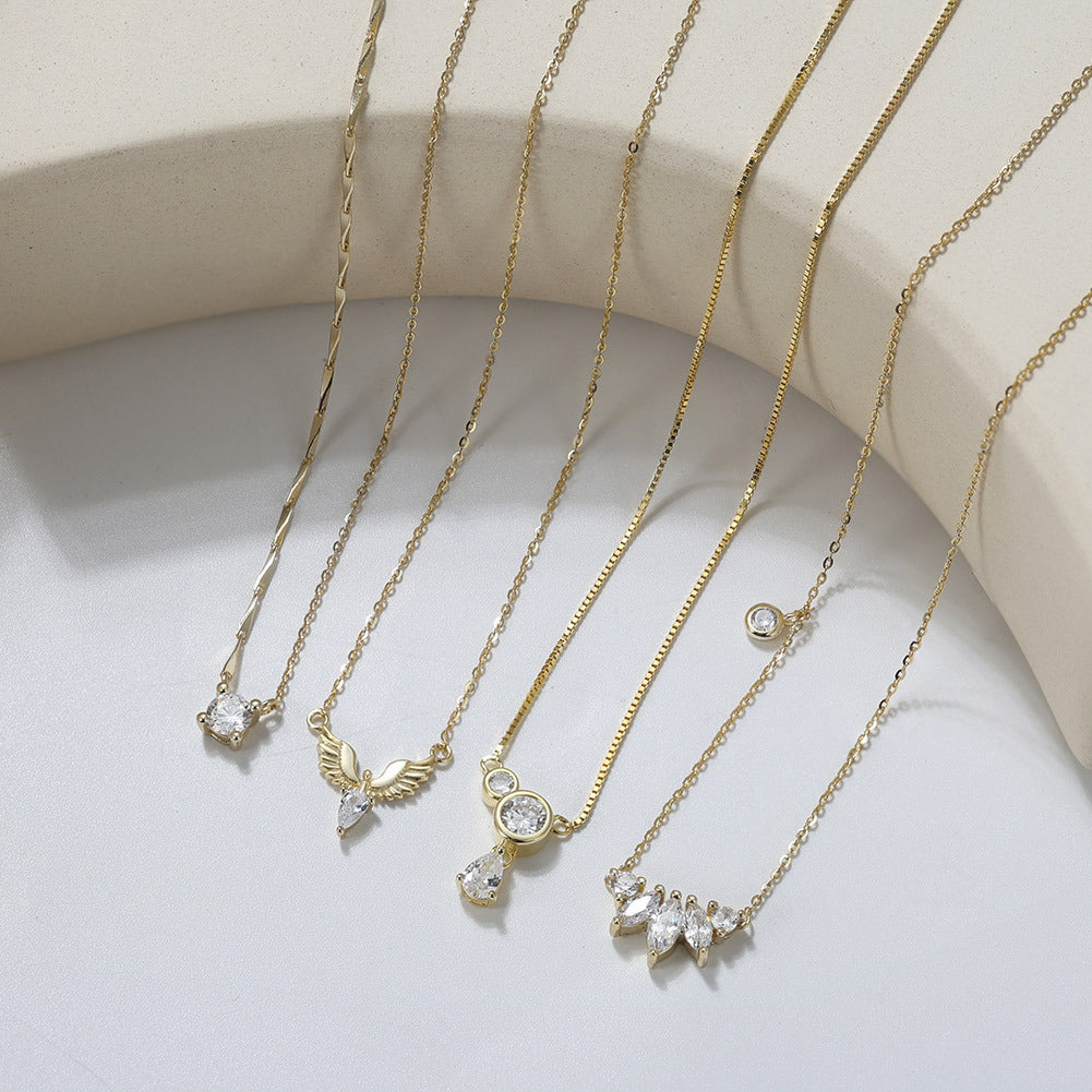 Featuring a 9×15mm pendant adorned with multiple 5A zircon stones — including one 3mm round and several marquise-cut gems — this handcrafted piece blends luxury and minimalism. Available in silver and gold tones, it offers timeless brilliance for daily wear or special occasions.