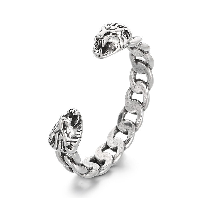 The cuff features detailed lion and snake heads at each end.