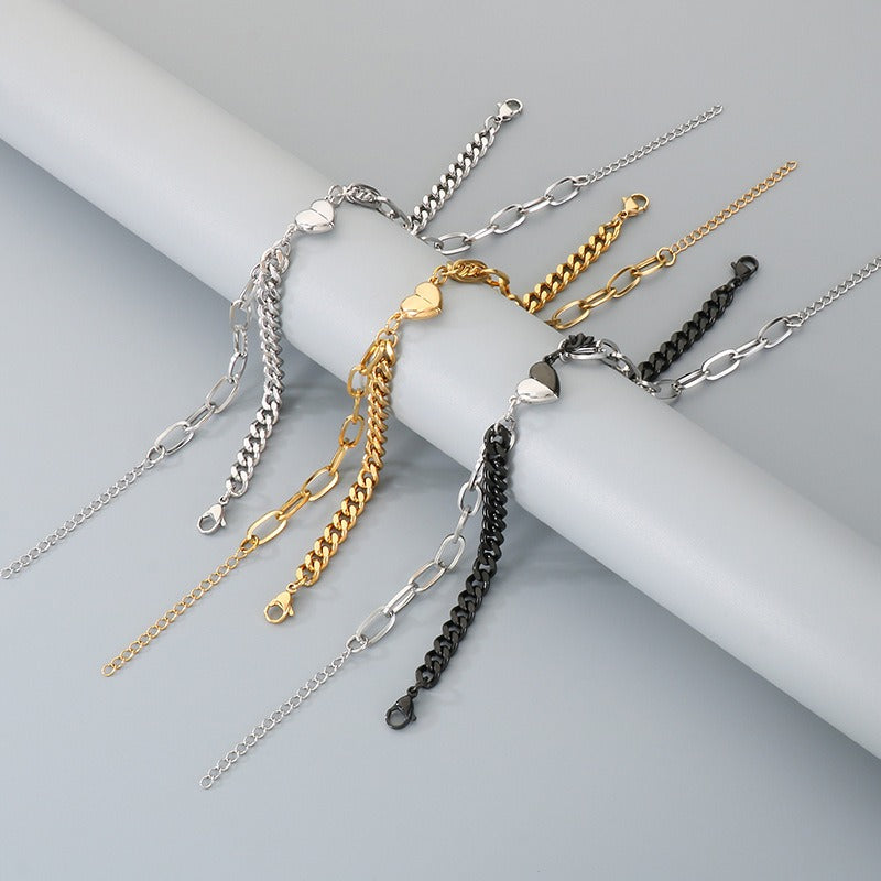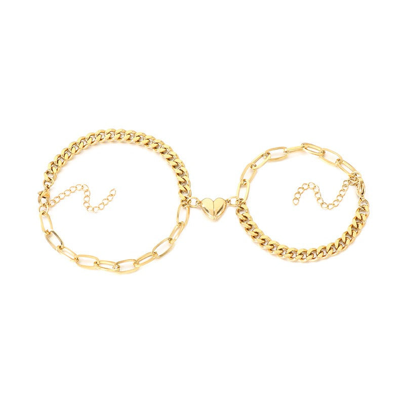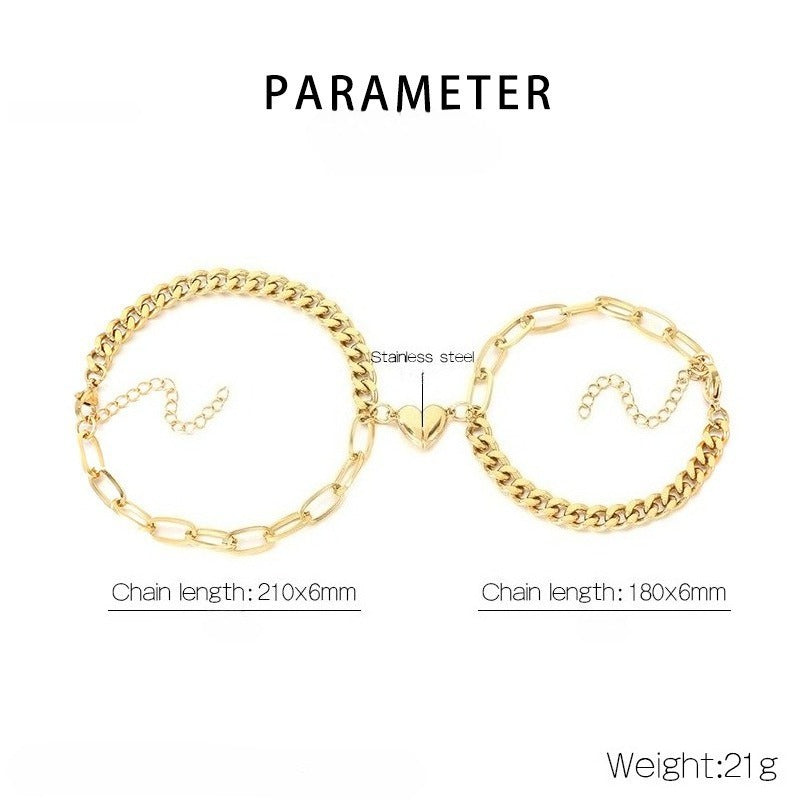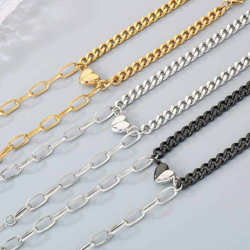 Wear your magnetic heart Cuban chain bracelet and share a subtle connection. Dual chain design and polished titanium steel bring modern matching style to everyday wear.