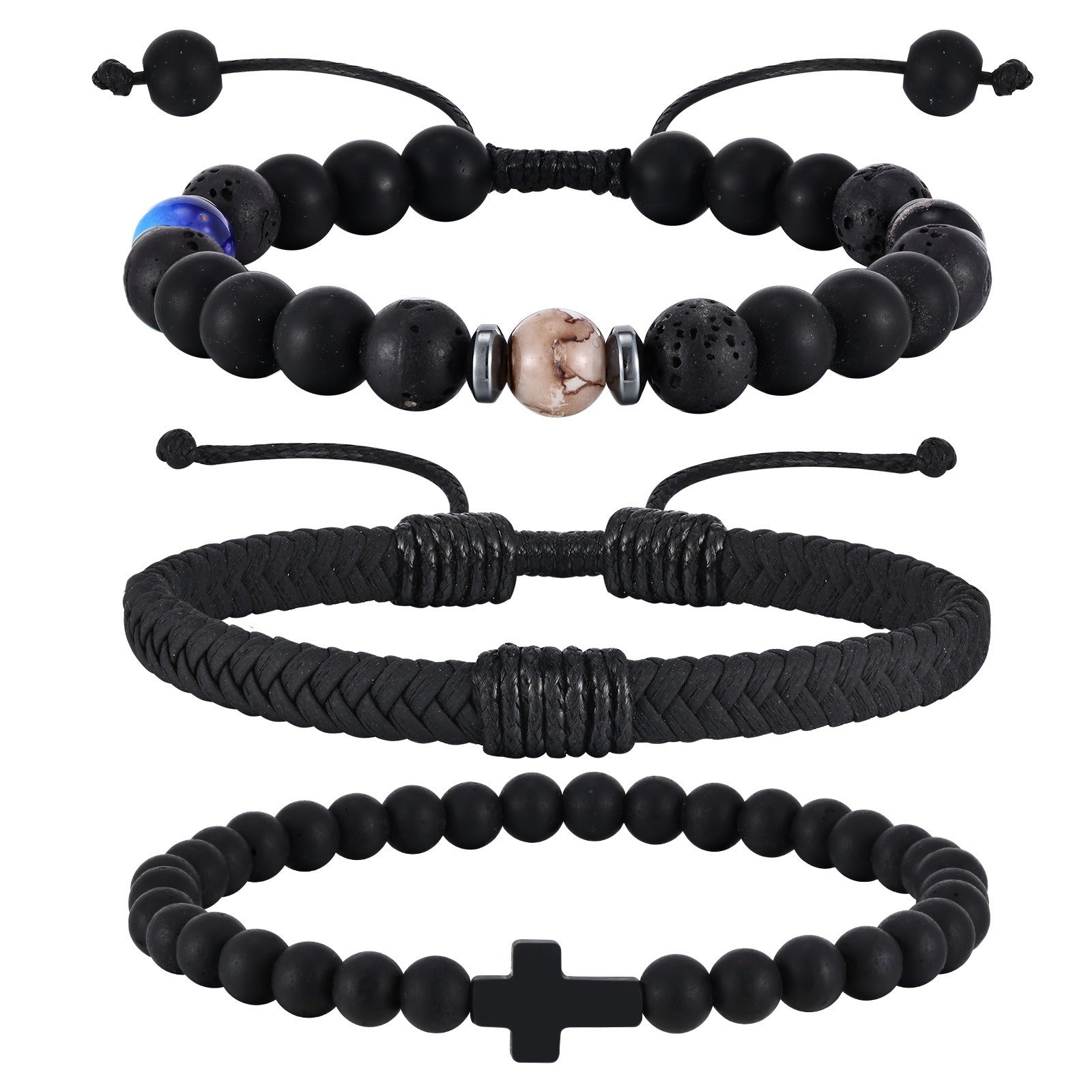 Includes three bracelets crafted from black onyx, lava stone, and braided PU leather for a rugged, masculine layered style.