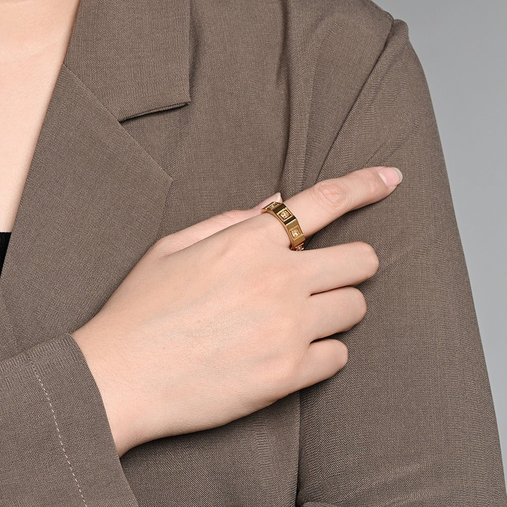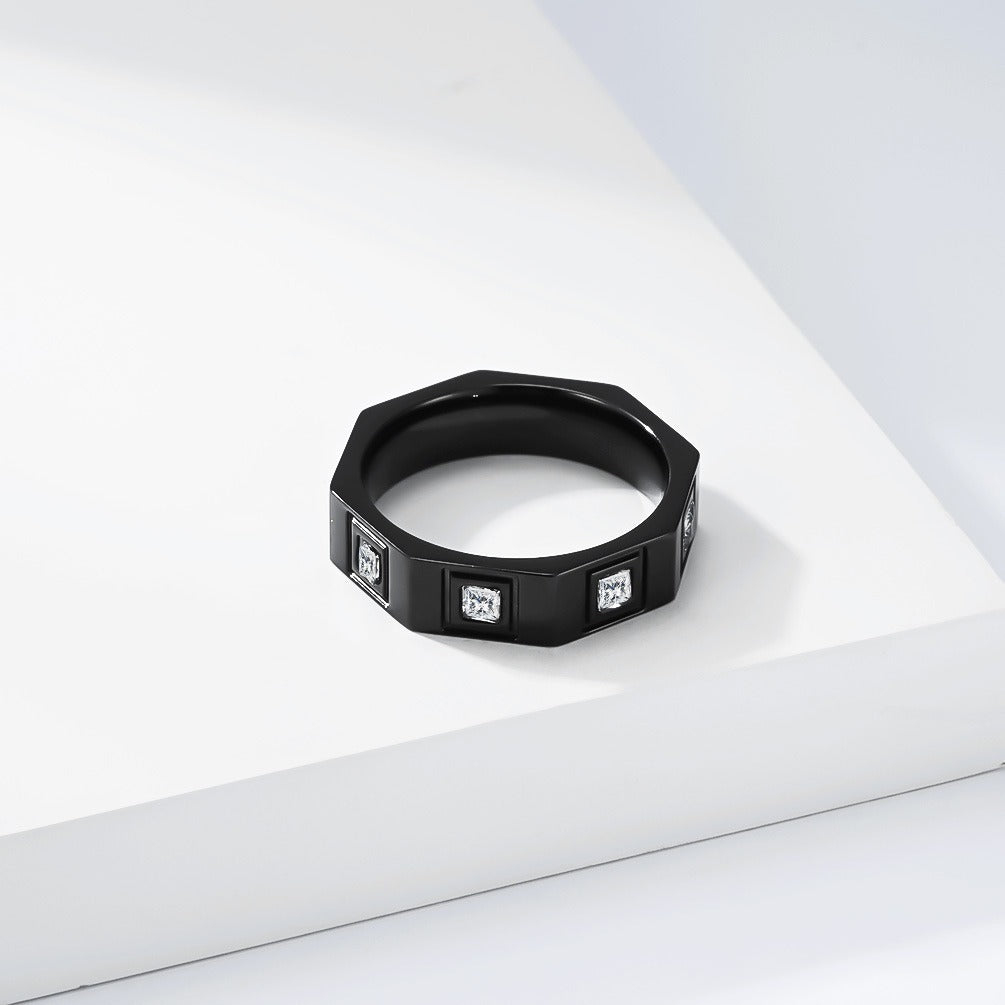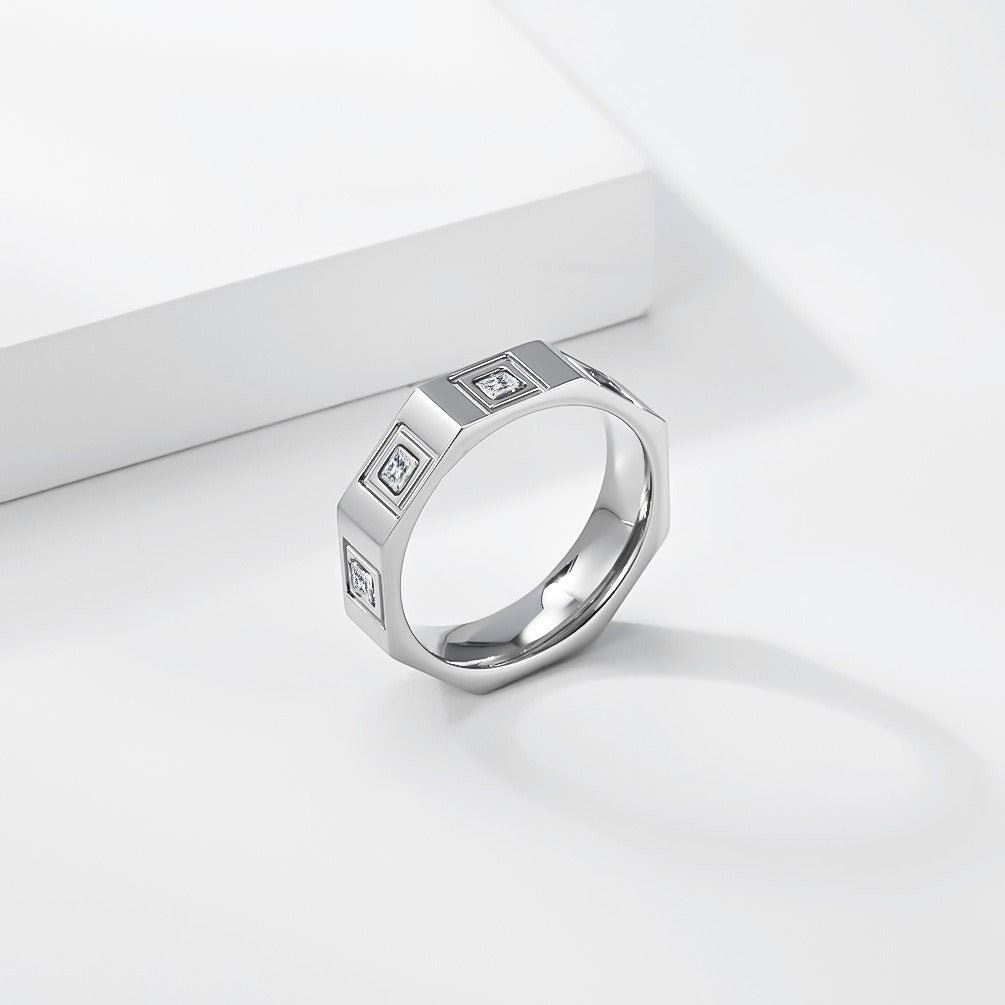 Square zirconia stones are set around the band, forming a geometric rhythm that reflects light from different angles.