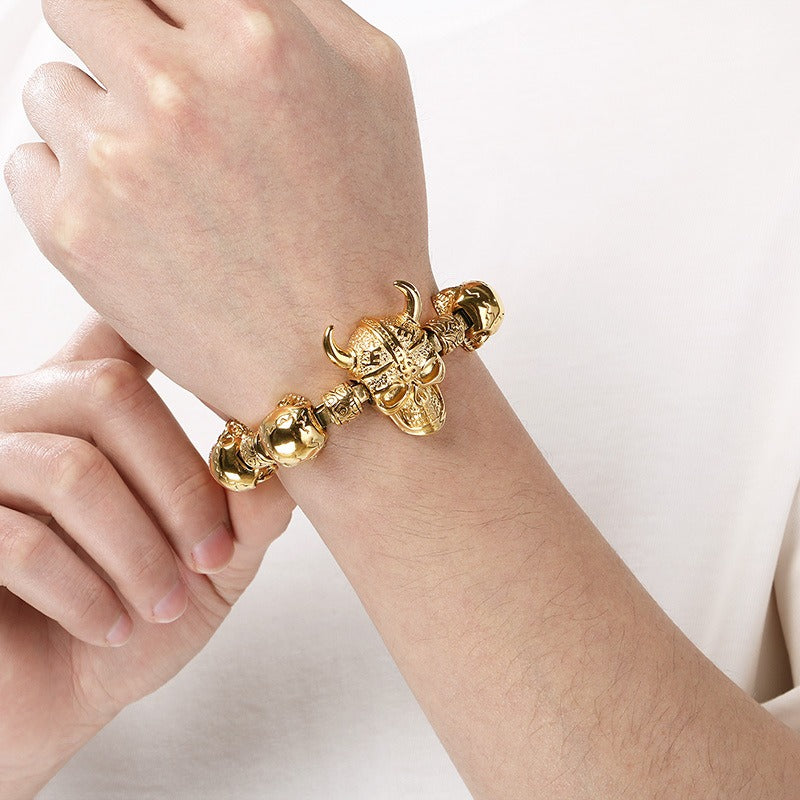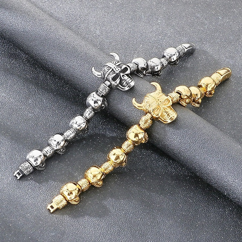 It drops onto your wrist with weight, the skull links forming a continuous line that holds its shape, giving the bracelet a presence that feels direct and hard to ignore.