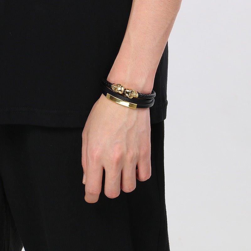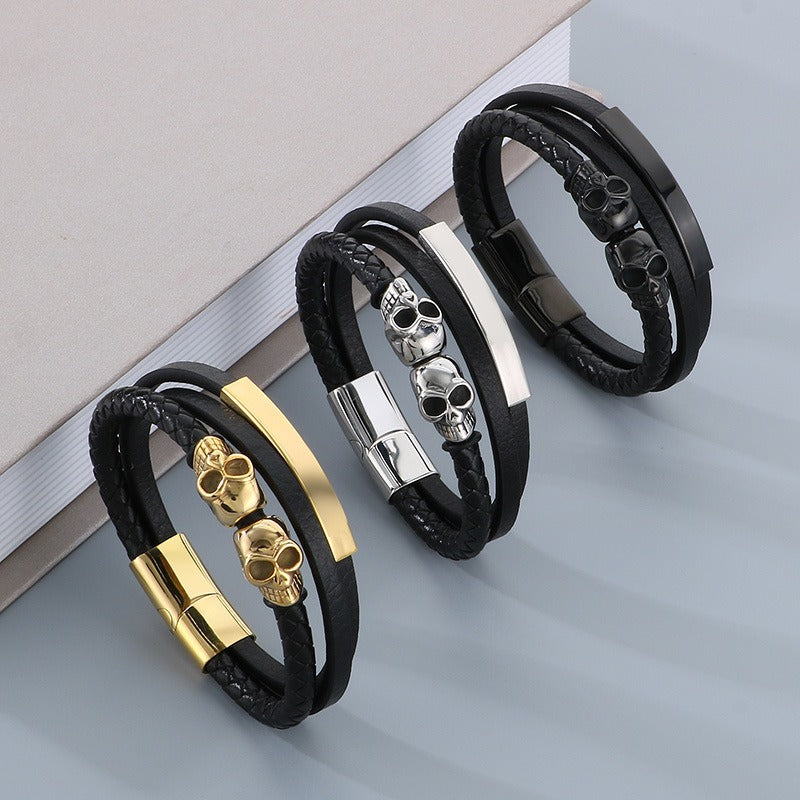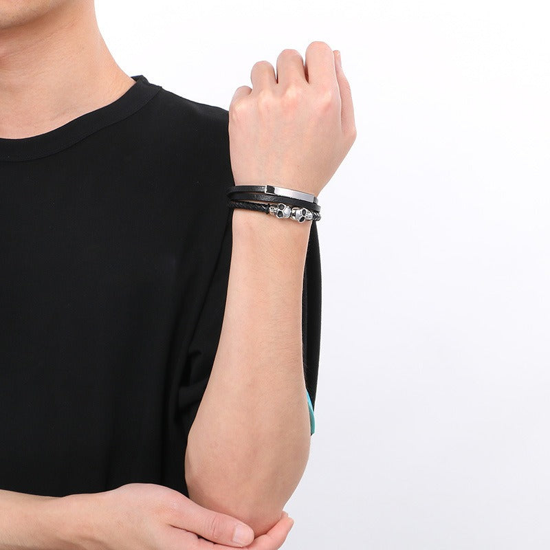 Unleash bold energy with Kemstone’s skull leather bracelet. Stainless steel skulls, layered black leather, and punk design create fearless men’s biker style.