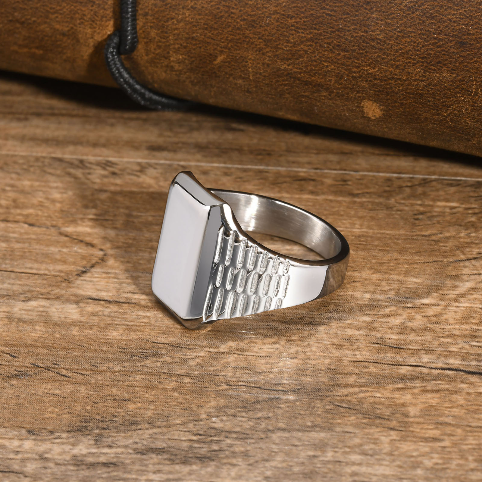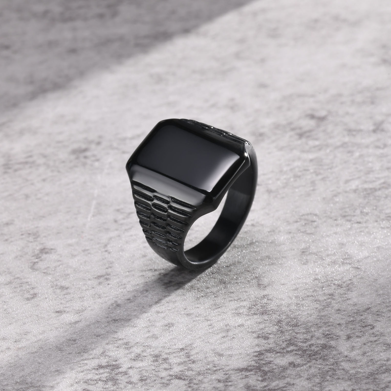 Wear this men’s stainless steel square signet ring with a flat matte top, balanced to sit low and centered on the finger with a steady, unobtrusive wearing state.