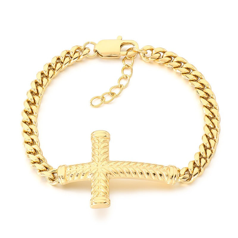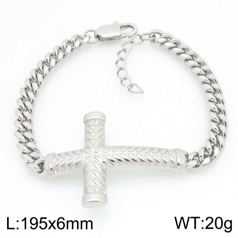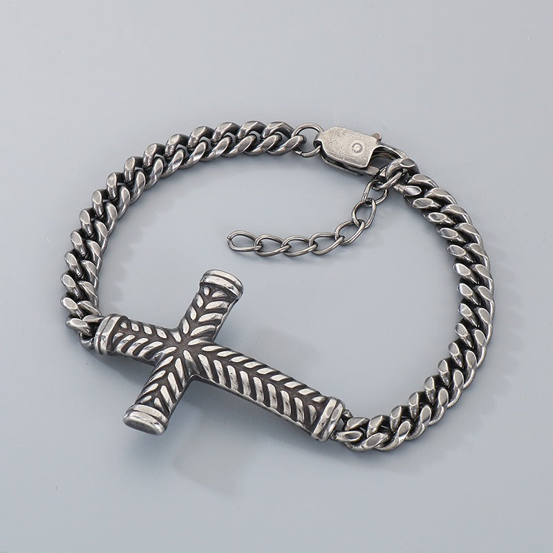 A striking cross pendant with twisted texture adds depth and symbolism to this bold bracelet, representing strength and faith with every wear.
