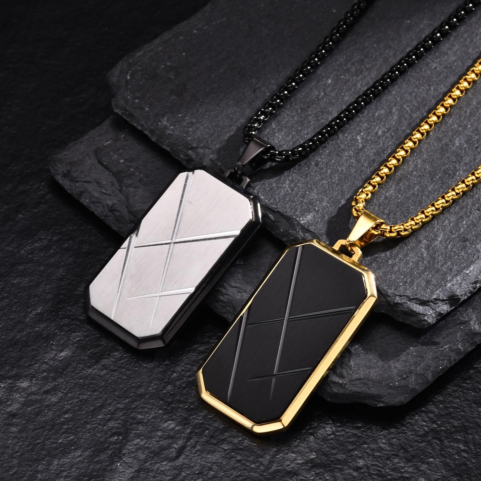 Wear defined structure with this stainless steel geometric bar pendant necklace for men. Sandblasted surfaces and cut-line detailing sit flat and centered, delivering focus and modern presence.