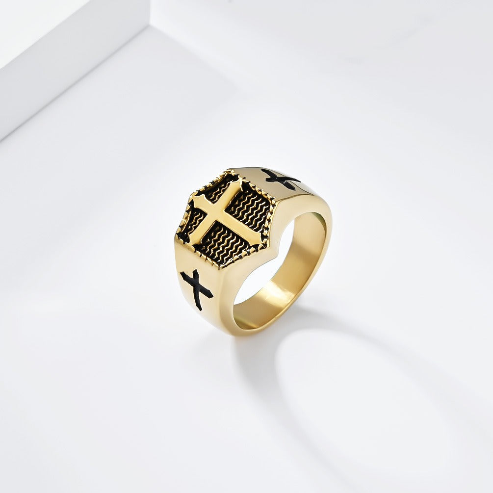 Featuring engraved crosses on a textured face, this ring embodies courage, protection, and unwavering belief.