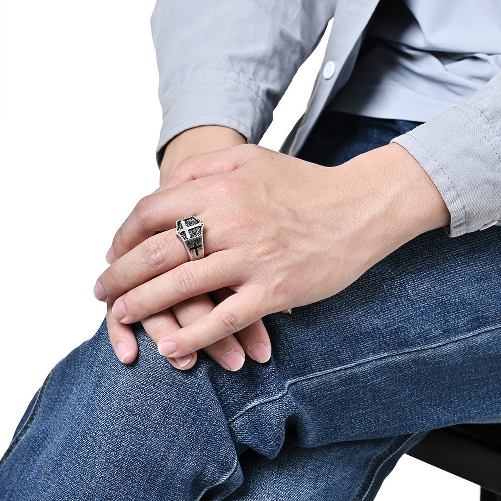 Channel bold faith and power with this stainless steel cross ring. Textured design, black detailing, and solid weight — built for men who lead with conviction.