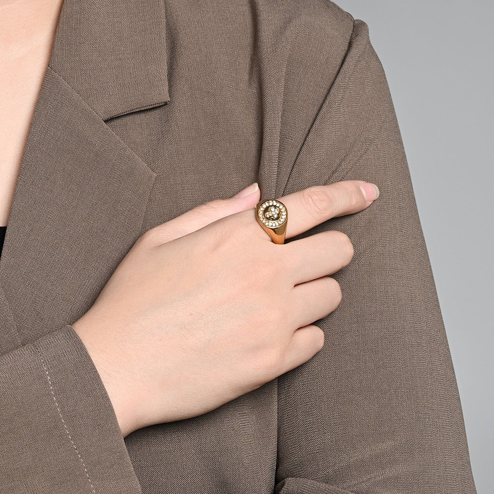 The structured signet silhouette creates a balanced and modern appearance.