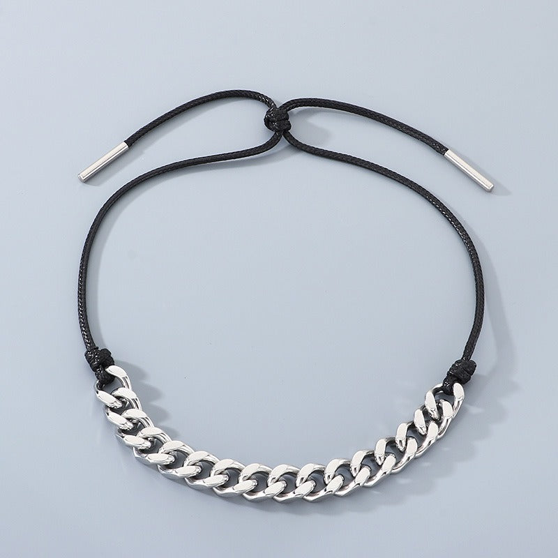 The black wax cord contrasts with the metal chain section.