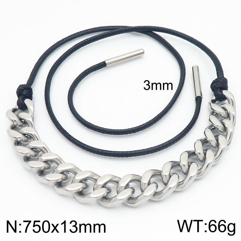 Add this titanium steel Cuban link necklace with black wax cord to your everyday look and let the bold chain detail bring a rugged western accent to modern men's style.
