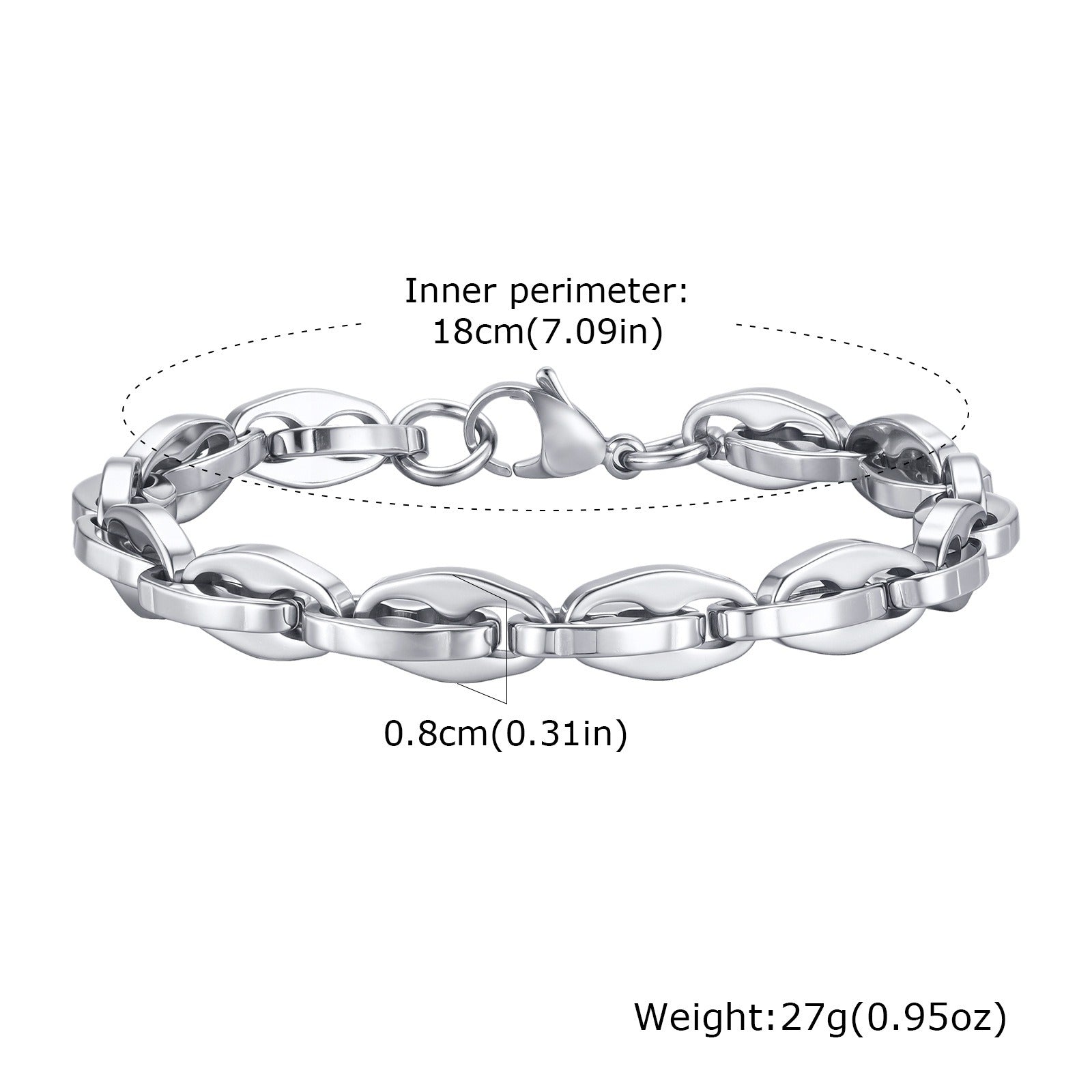 Inner perimeter approx. 18 cm with 0.8 cm link width, designed to sit naturally without shifting.