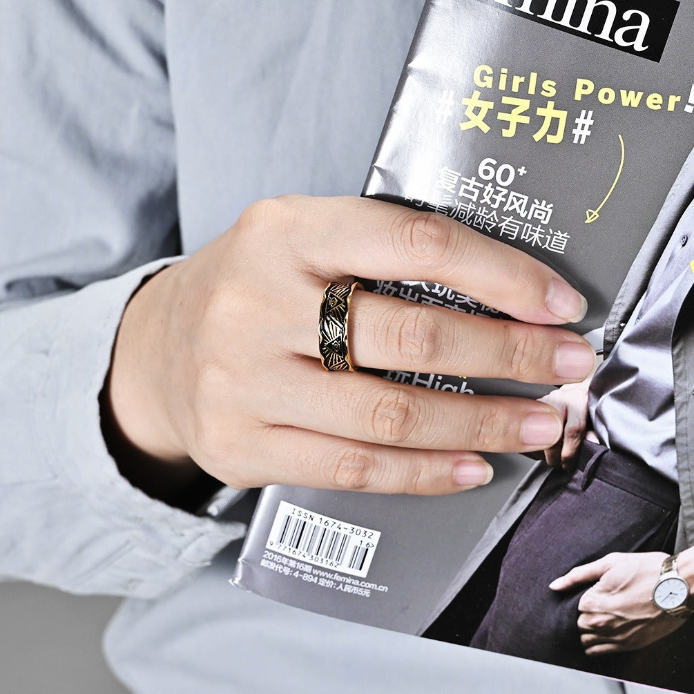 The intricate design, with striking black detailing, creates a bold visual appeal and makes this ring a standout piece.