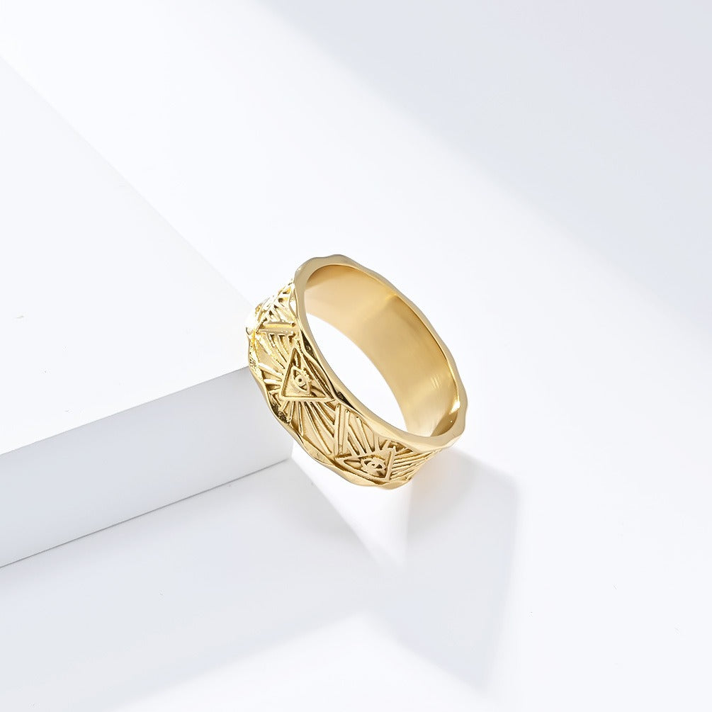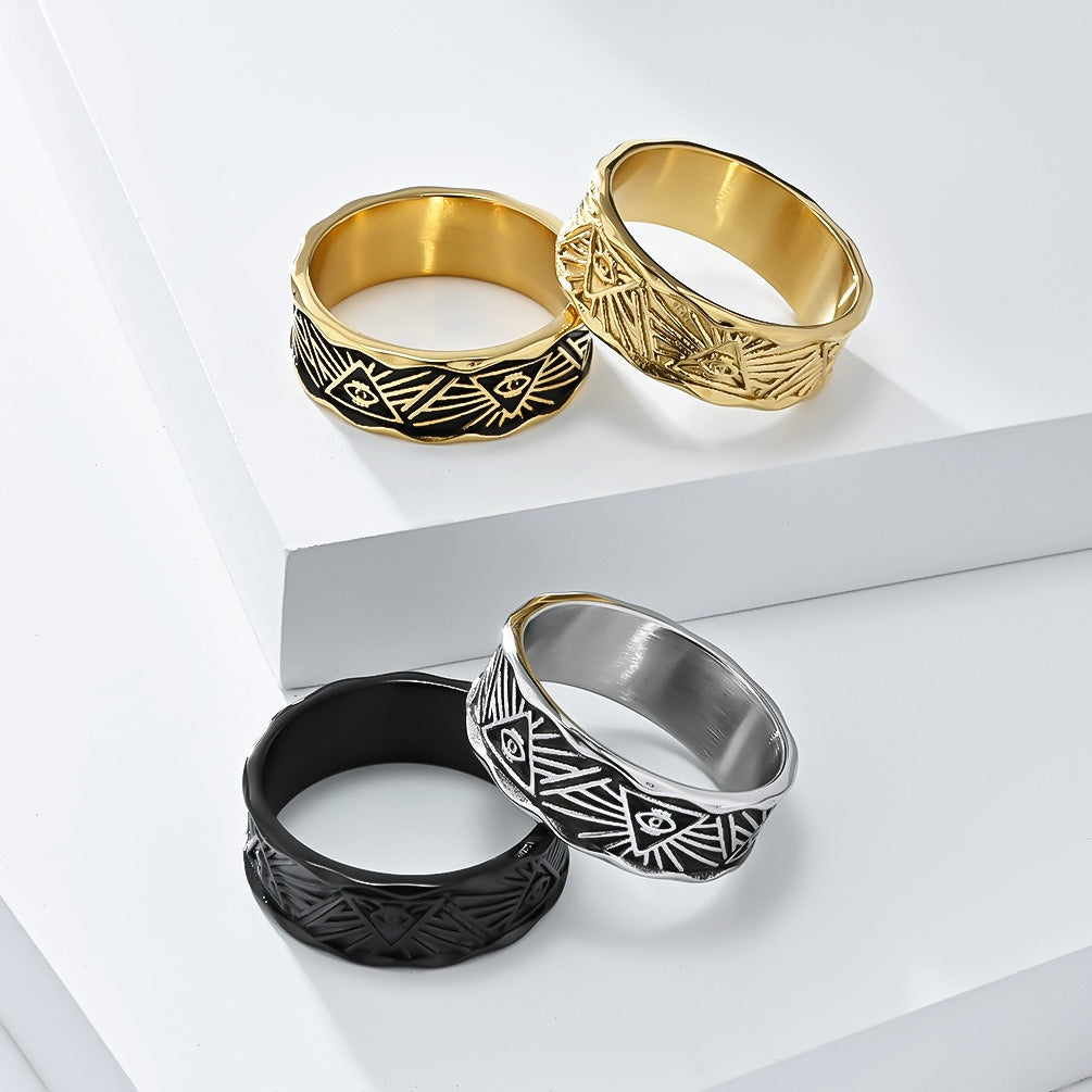 Embrace ancient symbolism with this stainless steel Horus Eye ring for men. Featuring bold detailing and a sleek finish, this ring combines historical significance with modern design.
