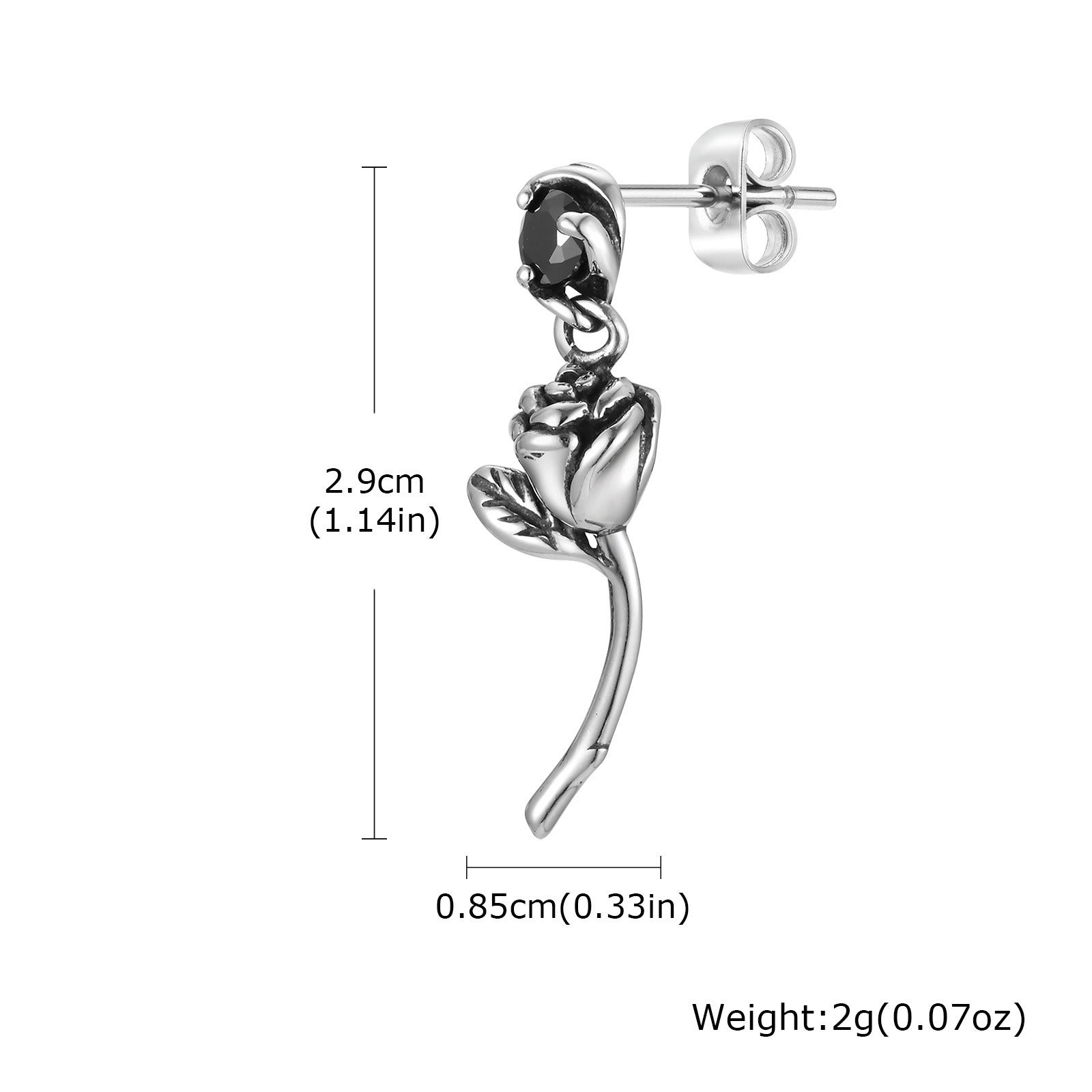 Wear dark contrast with this stainless steel rose drop earring for men. A black Cubic Zirconia accent and sculpted rose form create focus and a controlled, modern presence.