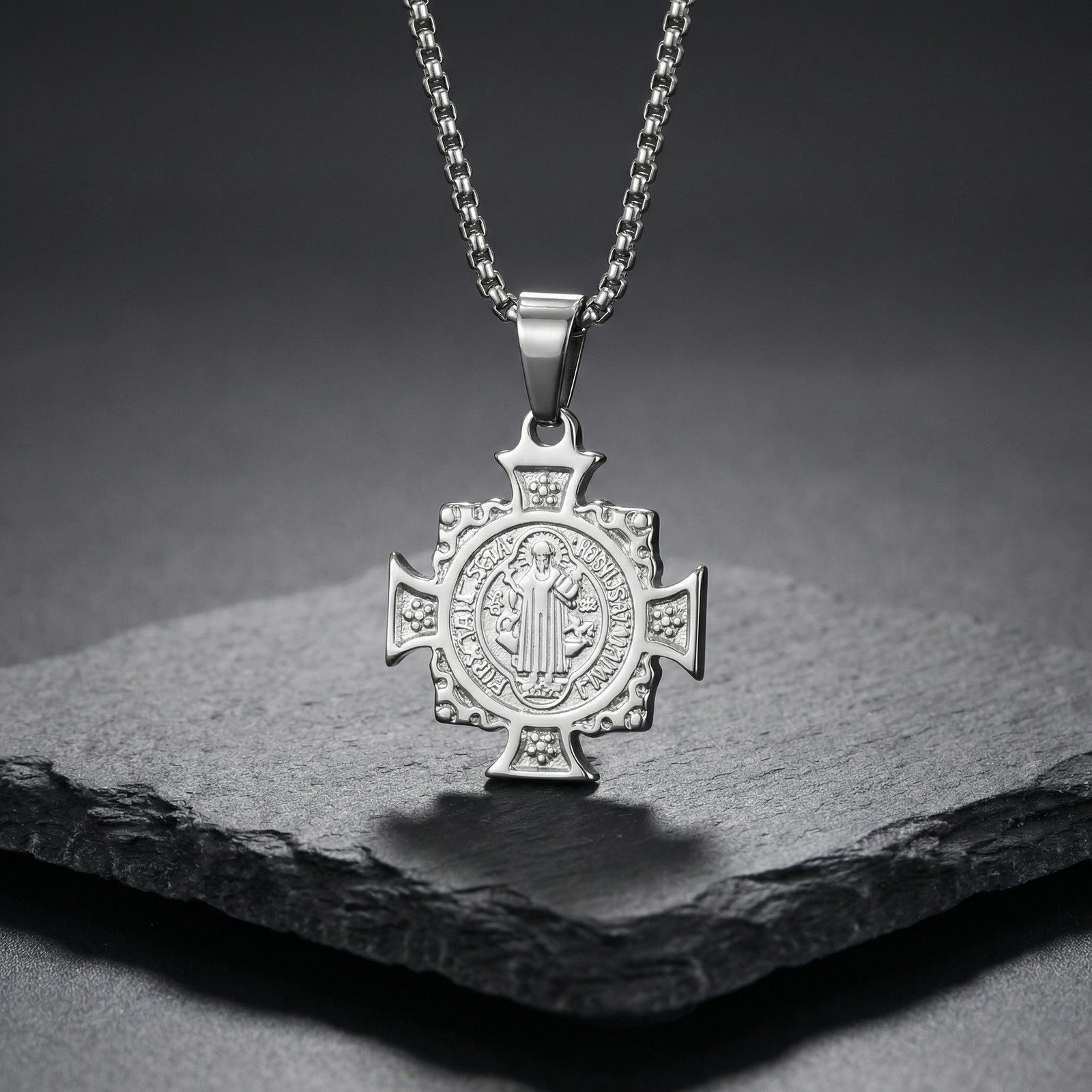 Wear this stainless steel Saint Benedict cross pendant necklace for men, designed with engraved detail and balanced weight, adding structure, focus, and presence to your look.