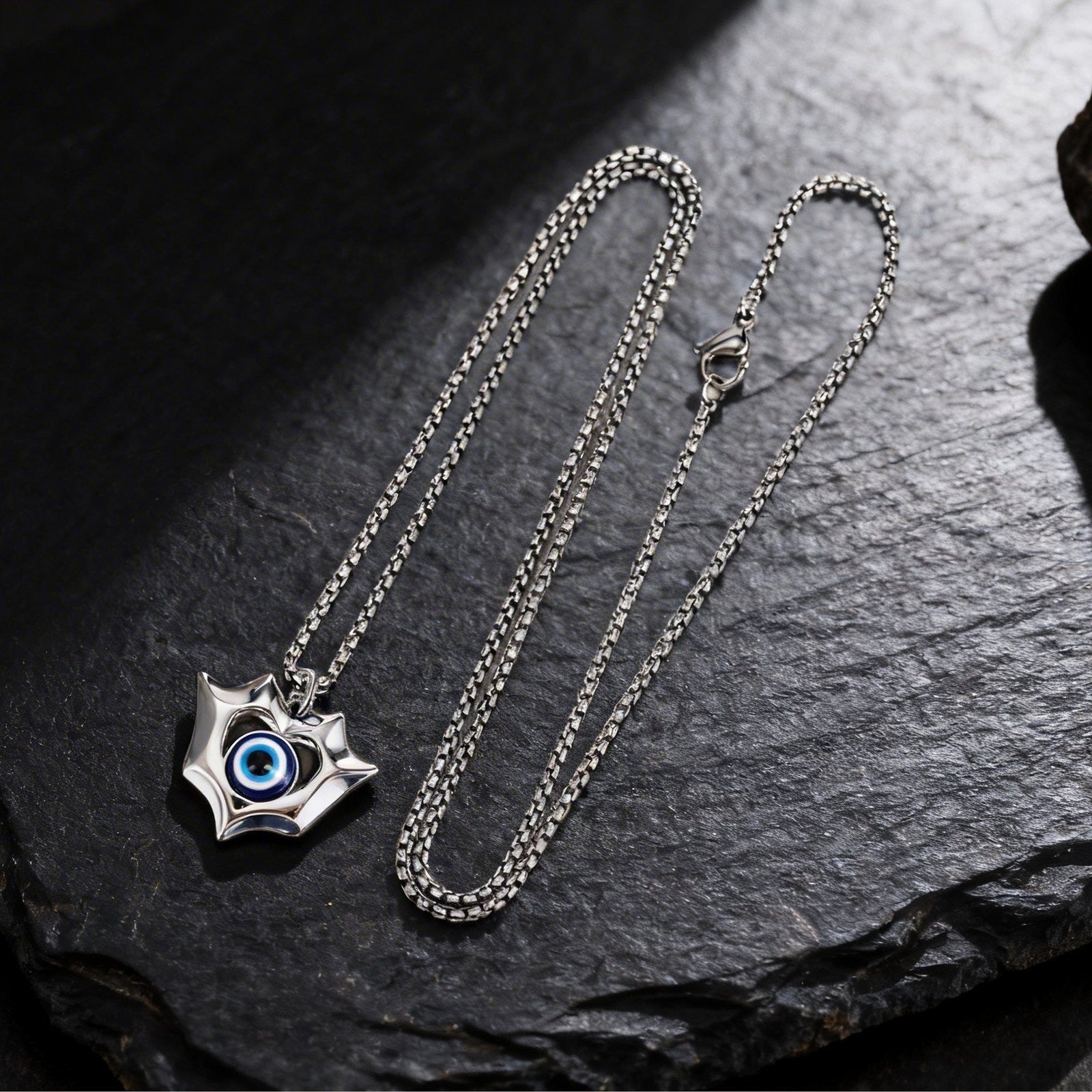 Wear this stainless steel shield eye pendant necklace for men and let the bold eye centerpiece and sculpted metal frame express your confident everyday style.