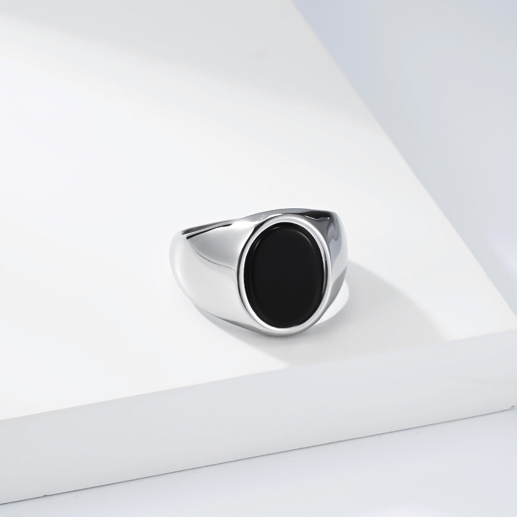 The oval top sits naturally on your finger, with a dark inlay that keeps everything clean and steady—nothing loud, just something that feels right once it’s on.