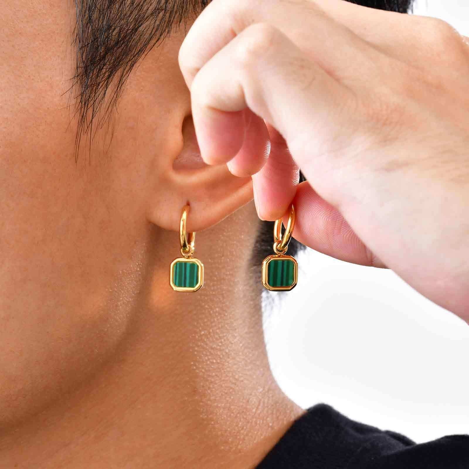 Minimalist square drops with natural shell, tiger eye, or malachite stones — refined, unisex, and full of character.