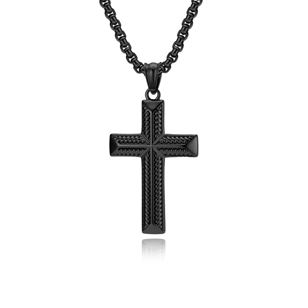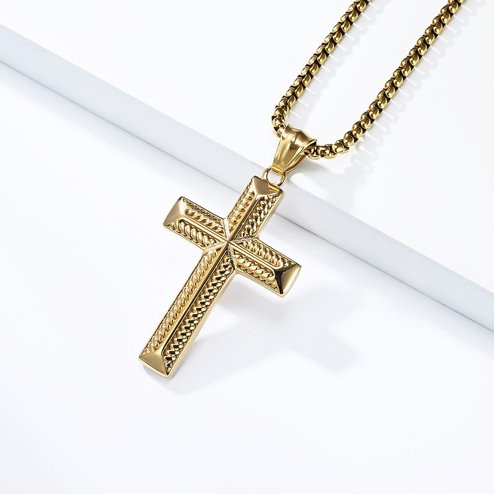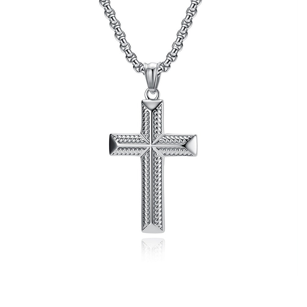 A structured cross necklace with rope-line detail, designed for men who appreciate clean form, texture, and a calm, confident look.