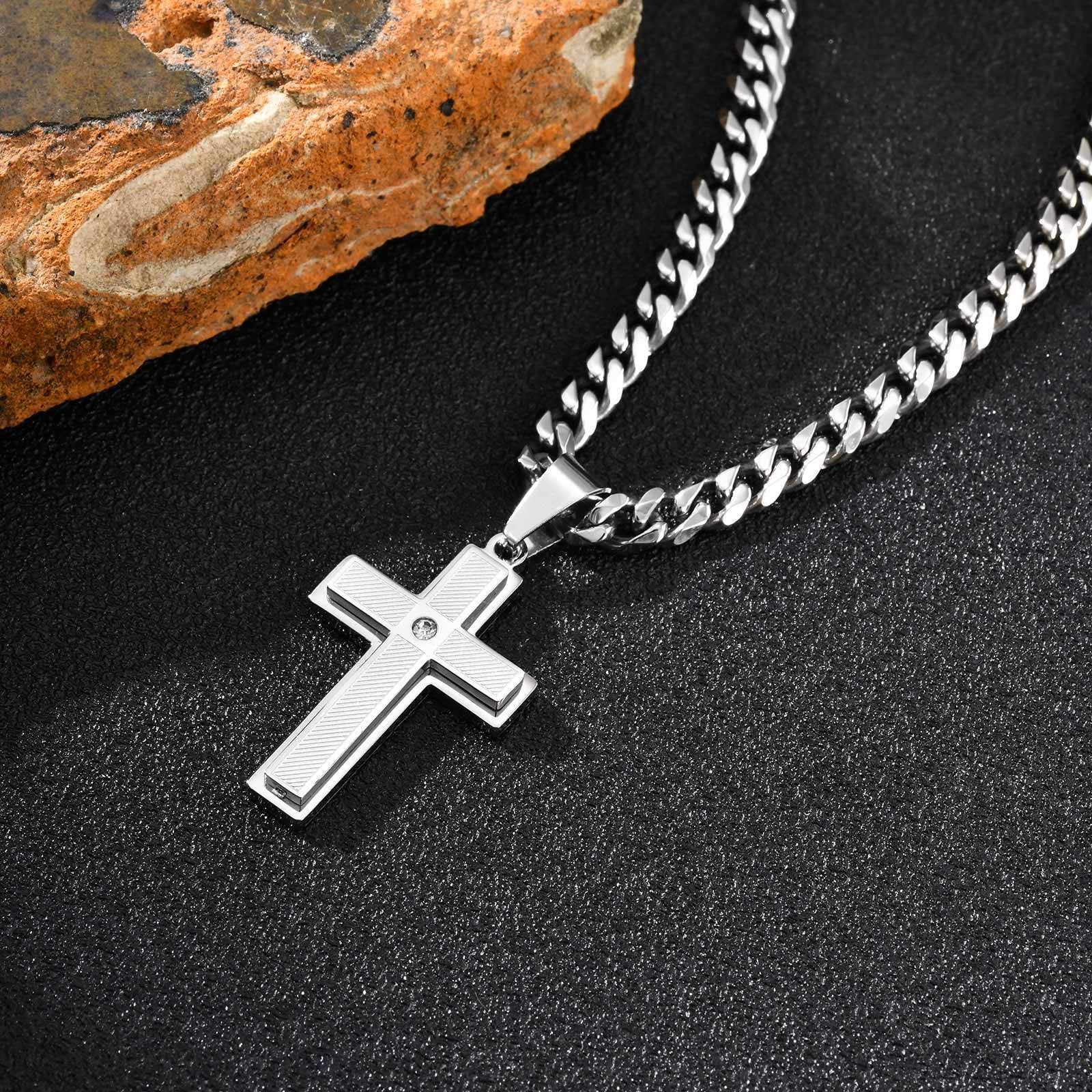 Kemstone Textured Cross Pendant Necklace for Men – Stainless Steel with Cubic Zirconia PN-2237