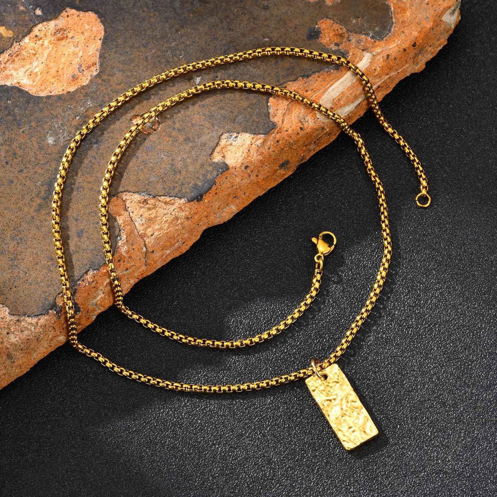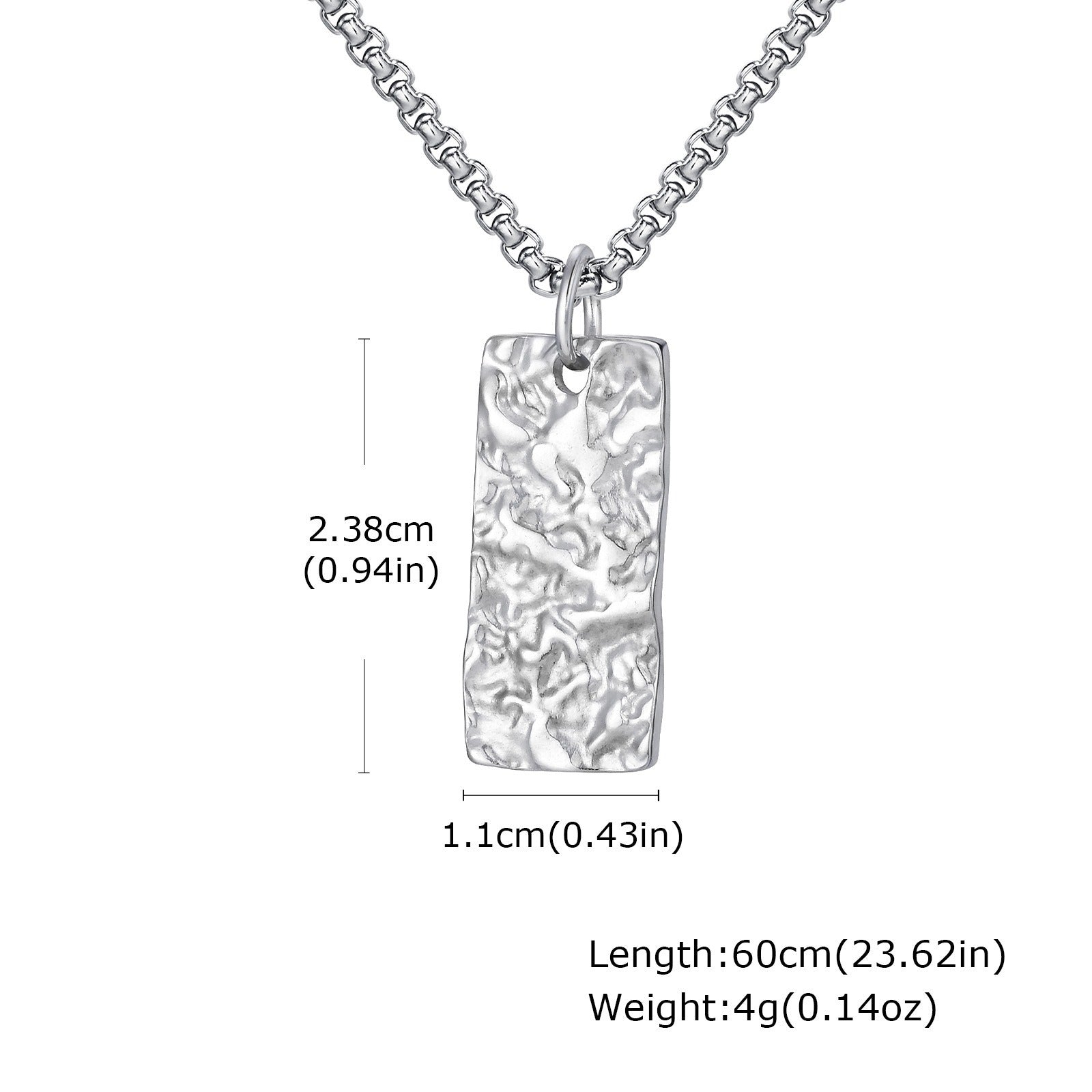 Wear a stainless steel rectangular pendant with sculpted surface detail and clean edges, bringing controlled shine, solid form, and modern masculine presence to daily styling.