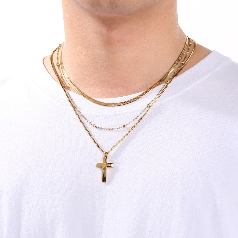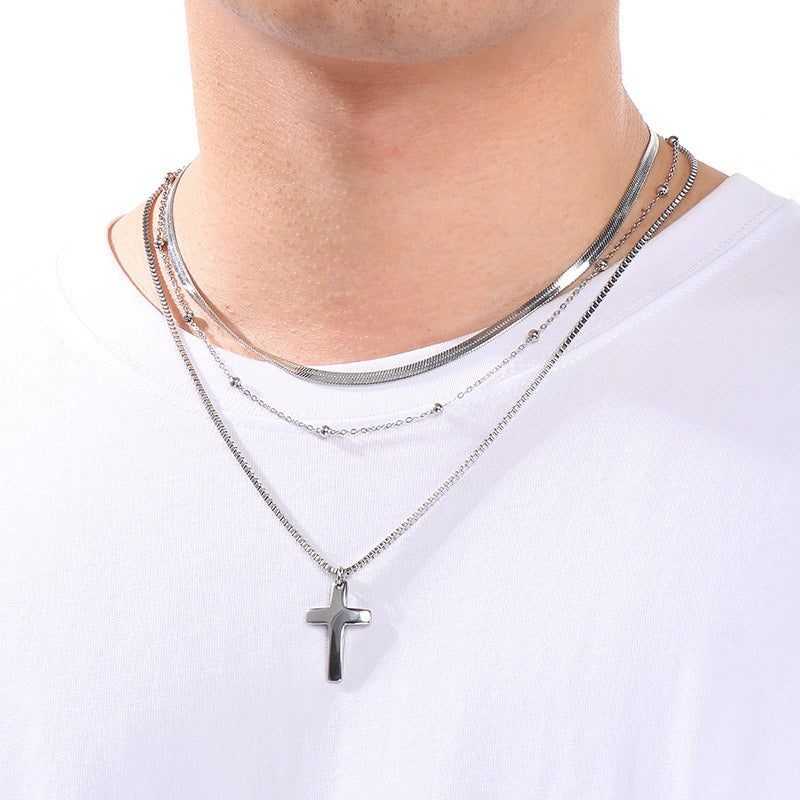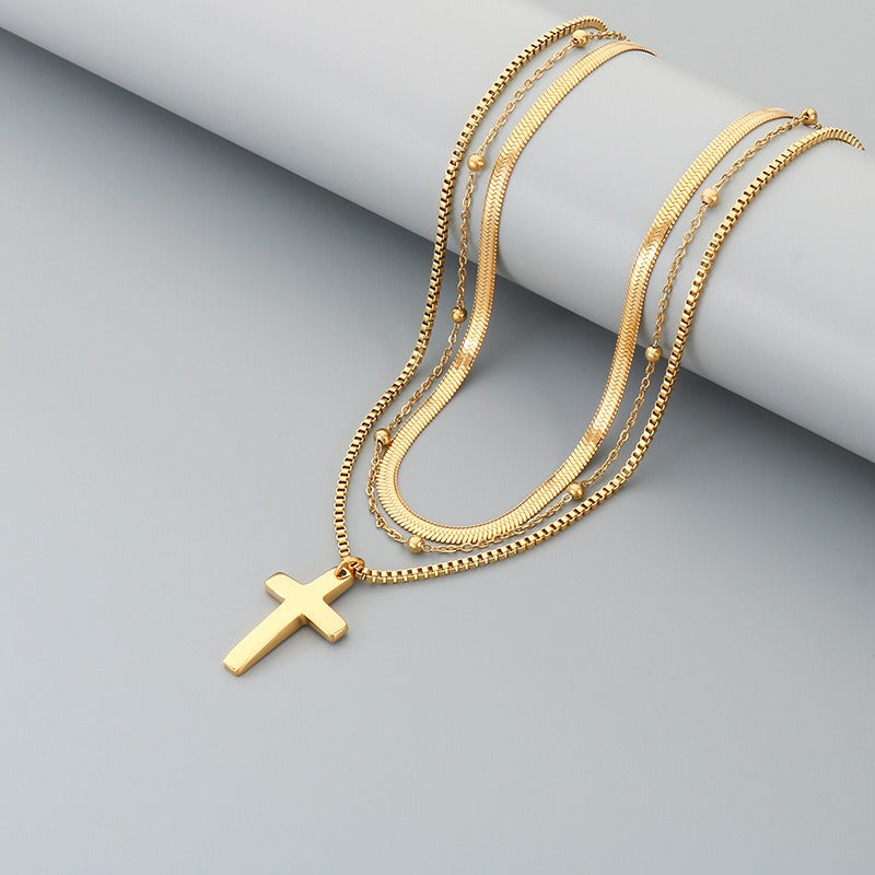The cross pendant and mixed chain structure bring balanced metal detail, giving you a versatile necklace for everyday wear.