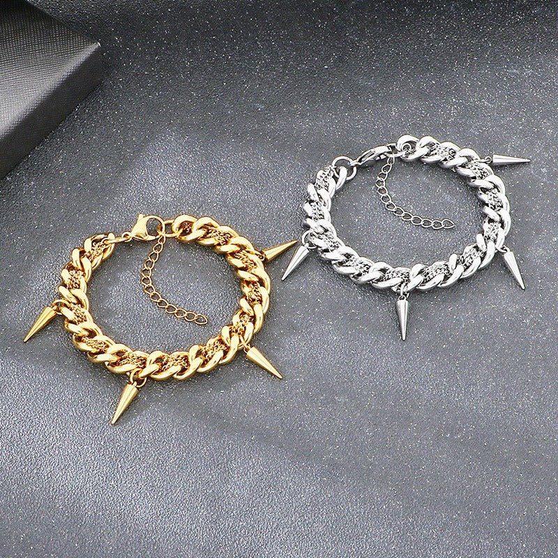 Add this titanium steel Cuban link bracelet to your wrist and let the layered chain and spike accents bring a bold punk edge to modern street style.