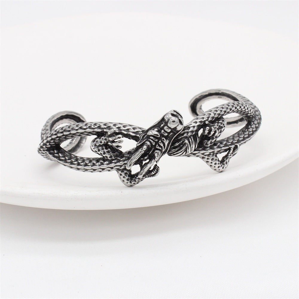 Wear a coiled dragon skull cuff bracelet for men in solid titanium steel. Sculpted form, scale texture, and balanced weight create grounded presence and controlled strength on the wrist.