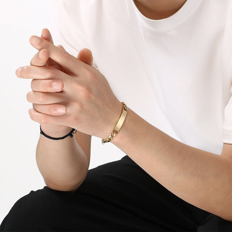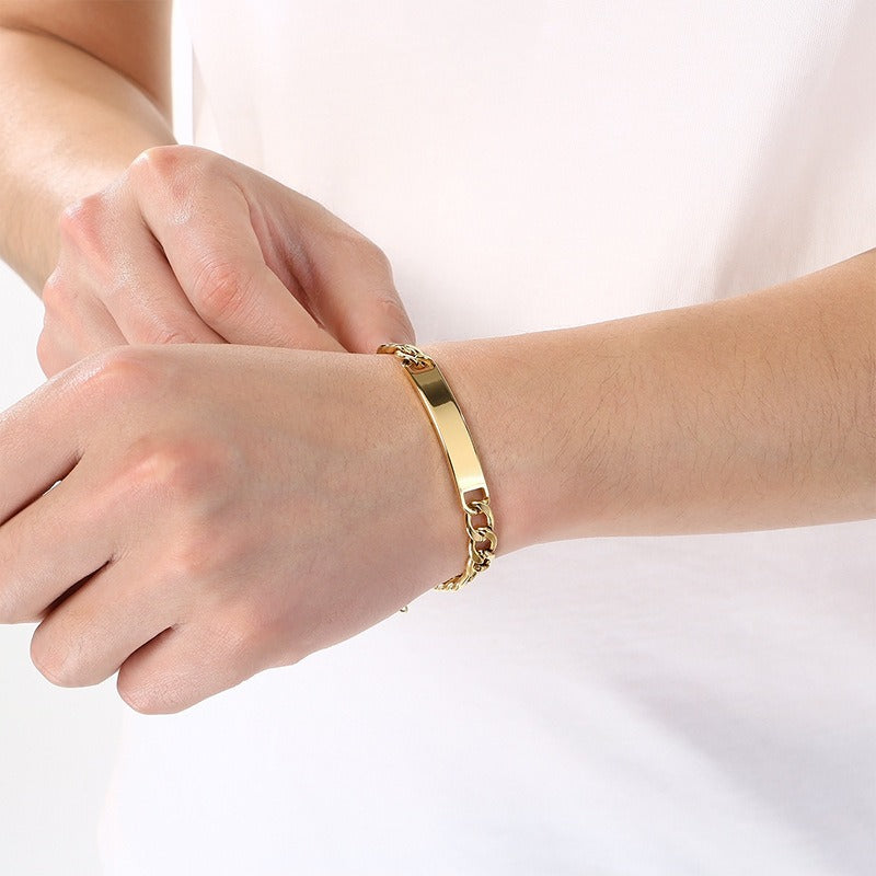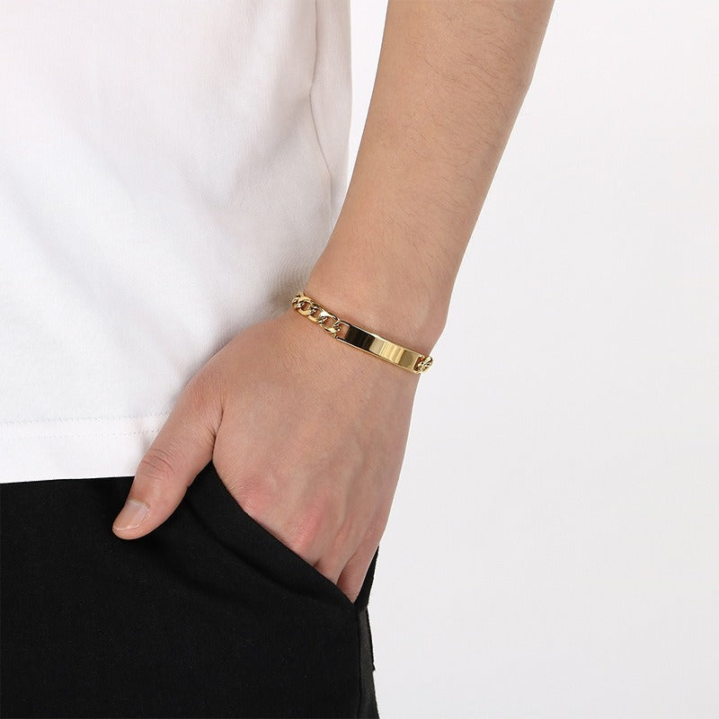 It sits close on your wrist, the curved bar catching light in a soft way while the Cuban chain keeps everything balanced, giving you a look that feels natural and easy to stay with.