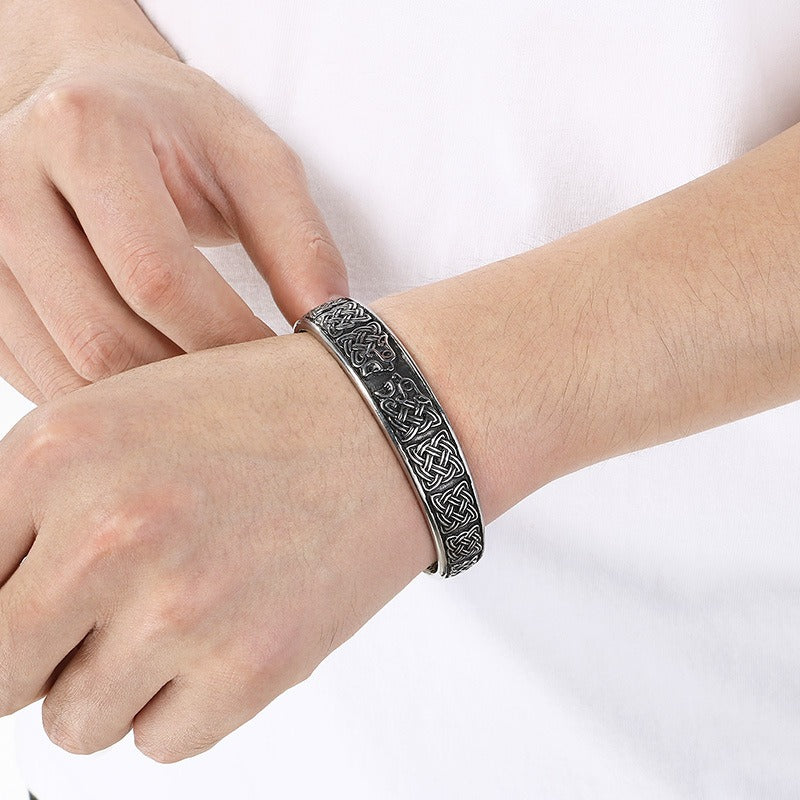 Define presence with this titanium steel Viking rune open cuff bracelet for men. Etched knotwork, solid weight, and controlled structure support focus, identity, and daily confidence.