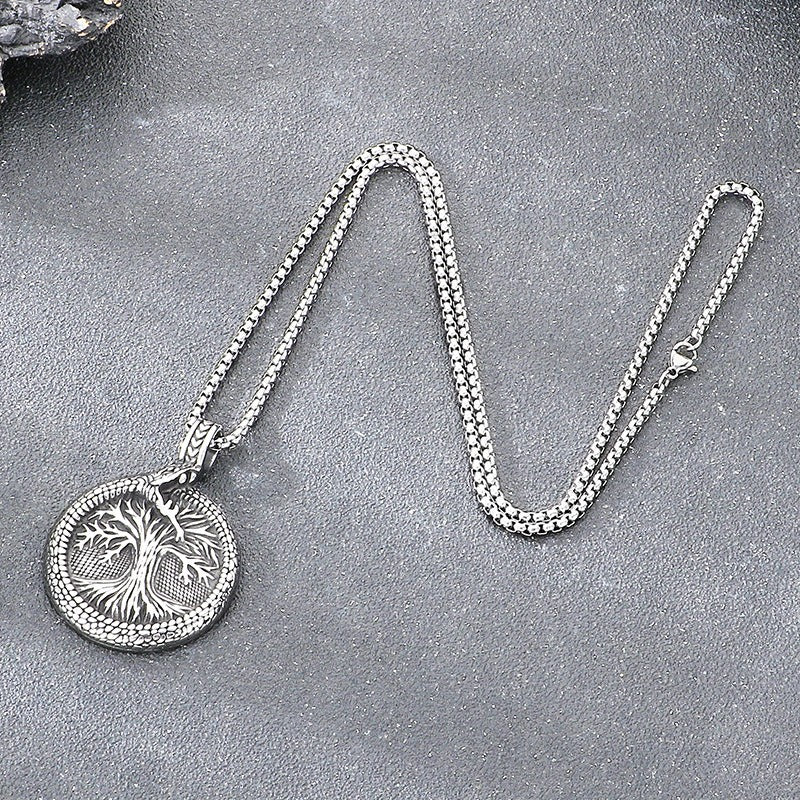 Wear this titanium steel Viking tree of life pendant necklace for men to express balance and continuity. Circular form and layered detail support a grounded daily presence.
