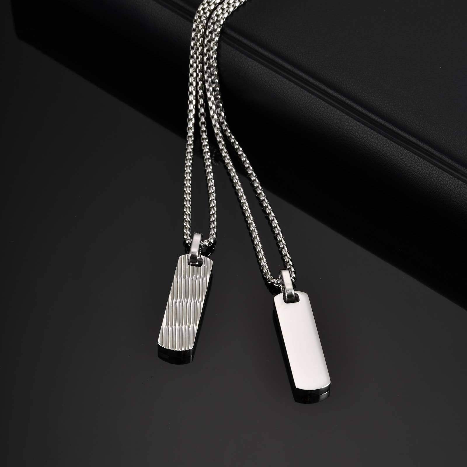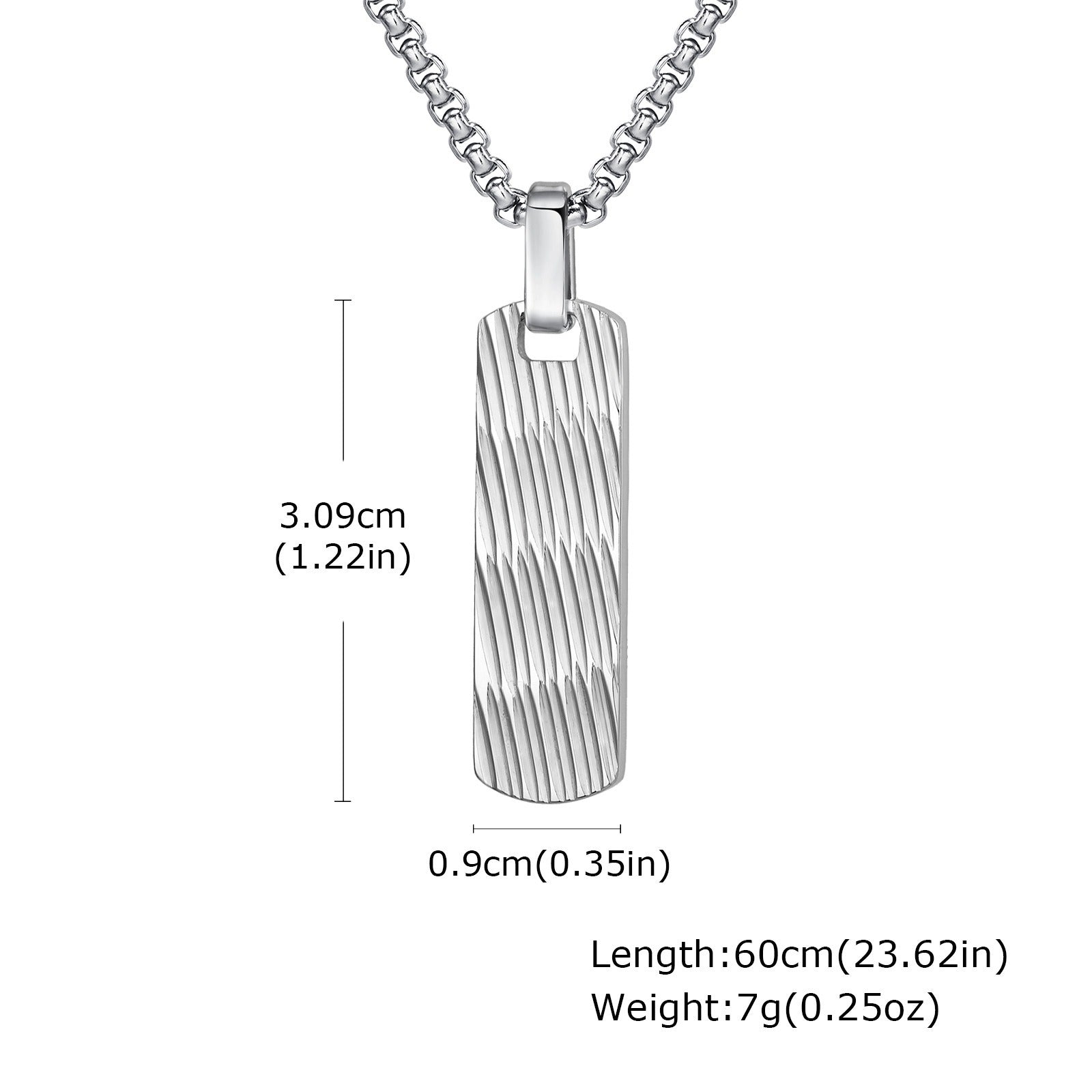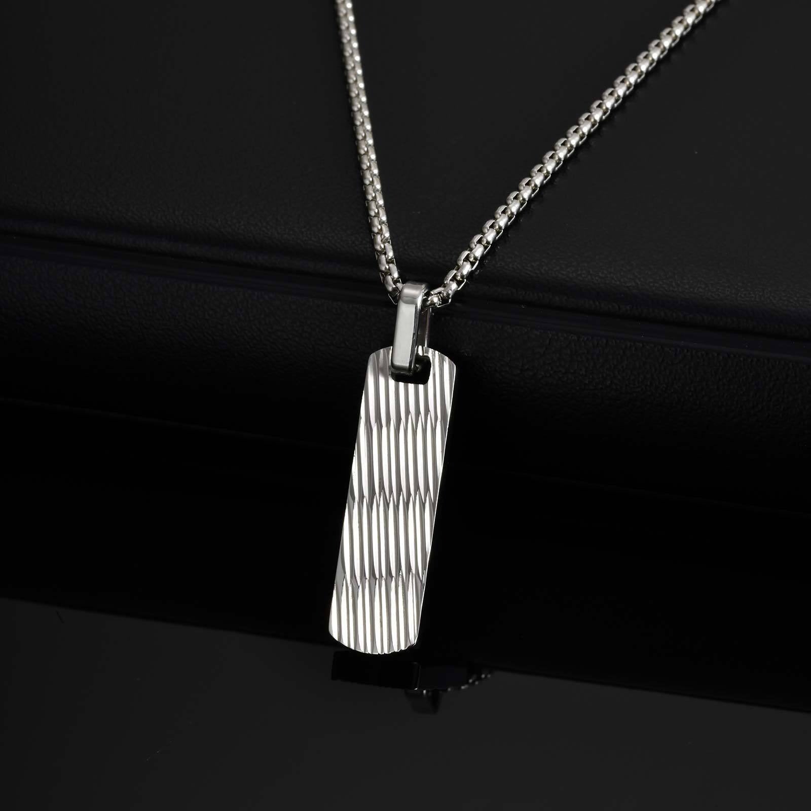 Wear a stainless steel vertical bar pendant necklace that settles centered on the chest, its diagonal texture and balanced weight shaping clean, controlled daily styling.