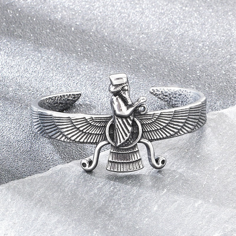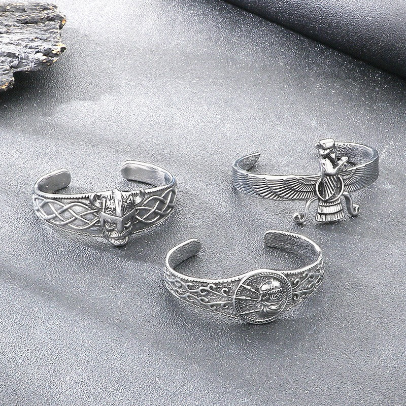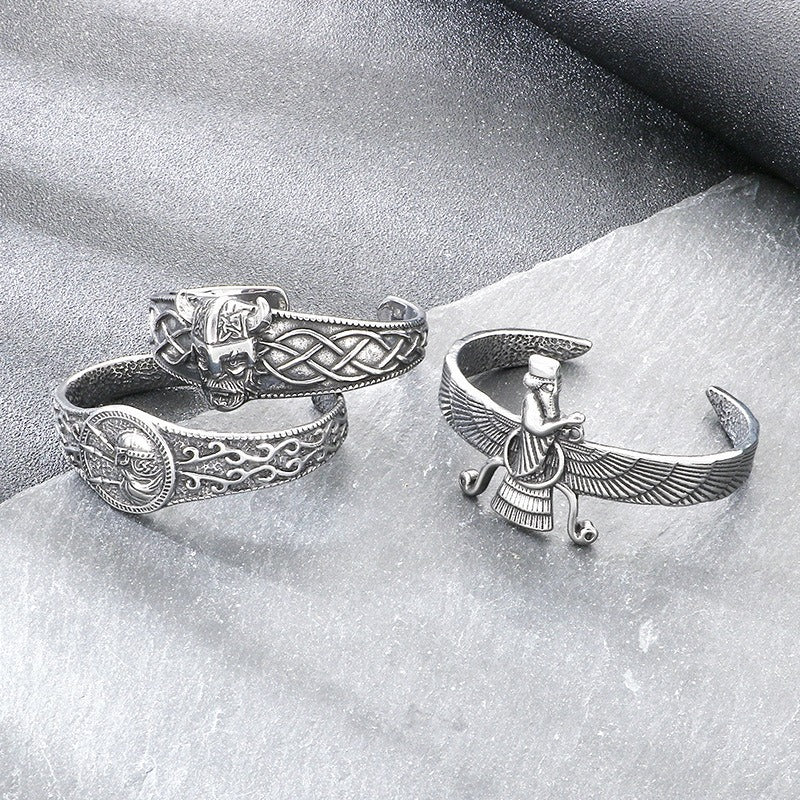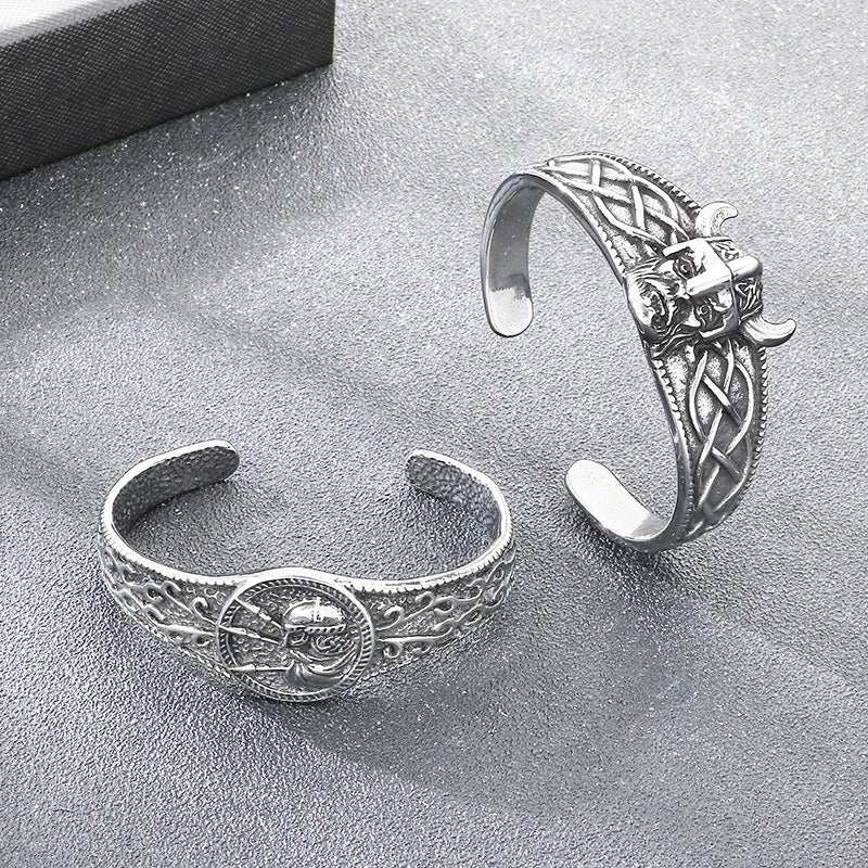 Place this titanium steel Viking cuff on your wrist and let the sculpted helmet detail, wing motif, and engraved Celtic knot patterns add bold vintage character to your everyday style.