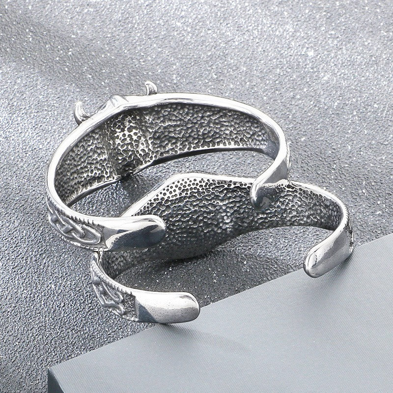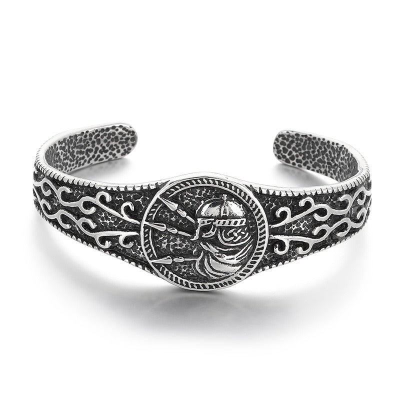 A sculpted horned helmet forms the focal point of the cuff.