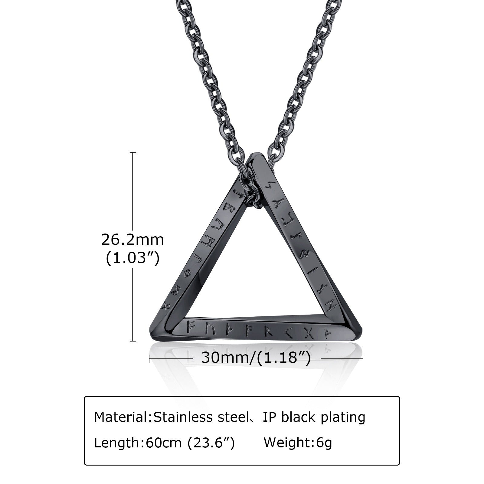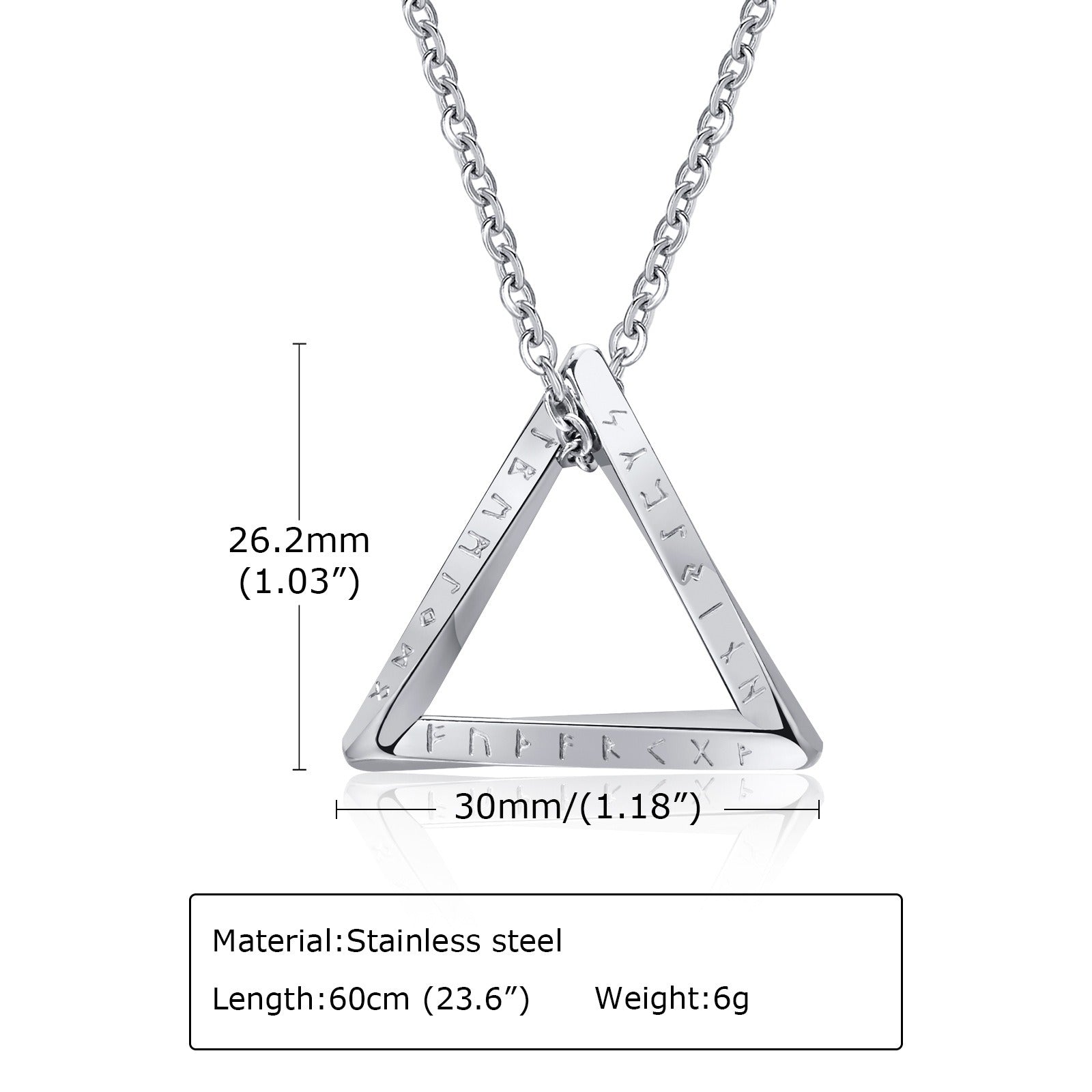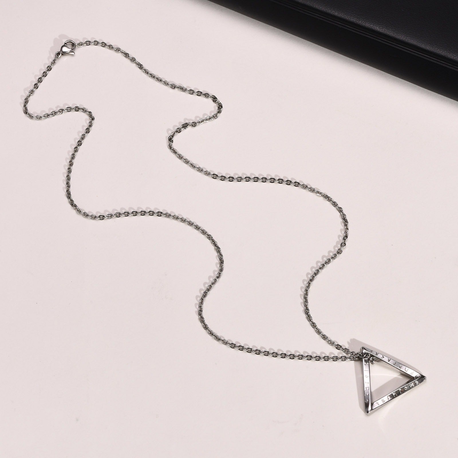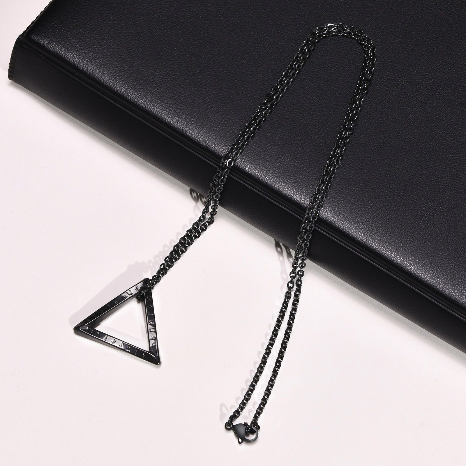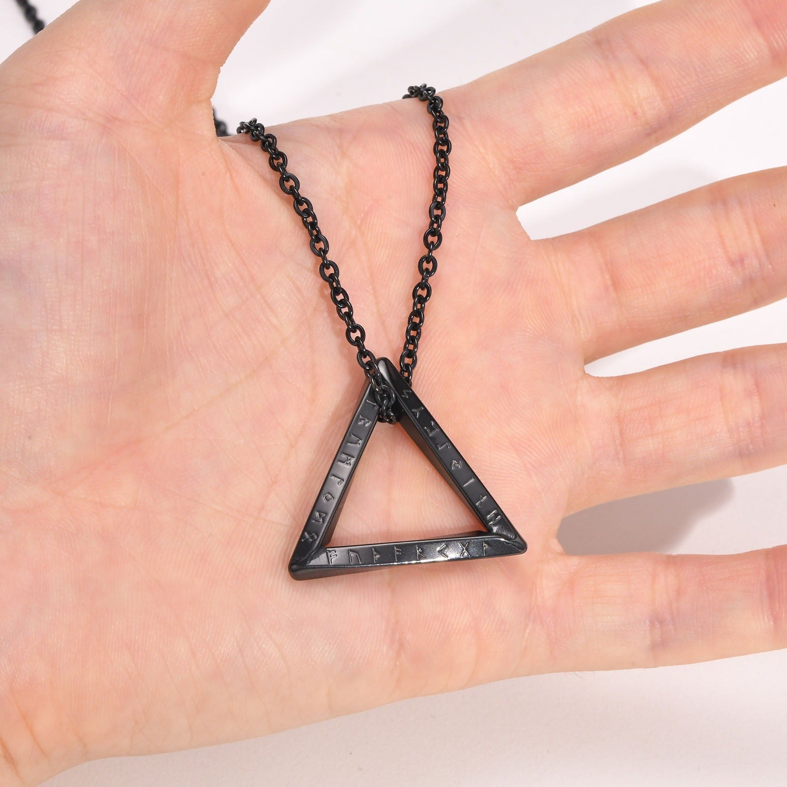 Triangular pendant etched with Viking runes, blending ancient symbolism with modern minimalist street style.