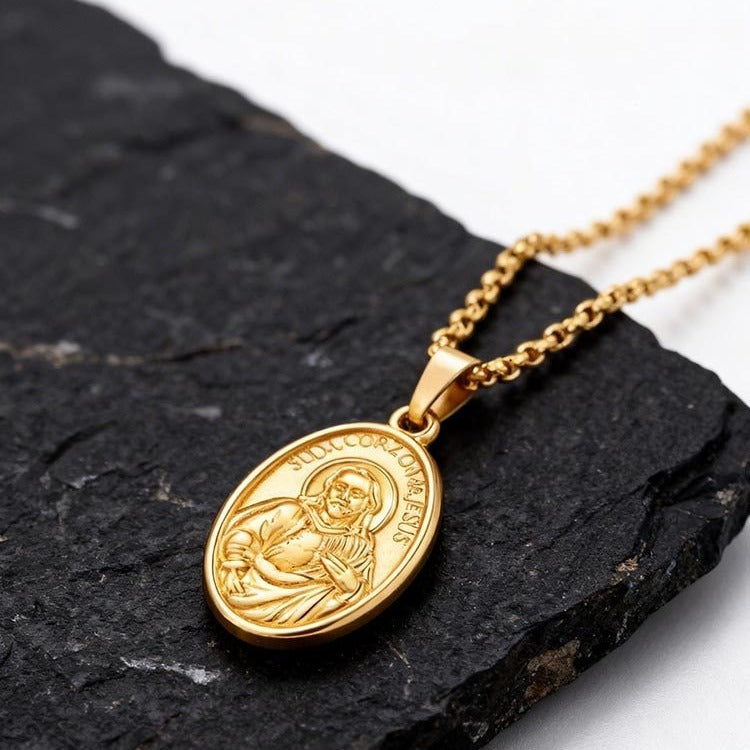 Oval coin pendant with raised portrait detailing on both sides.