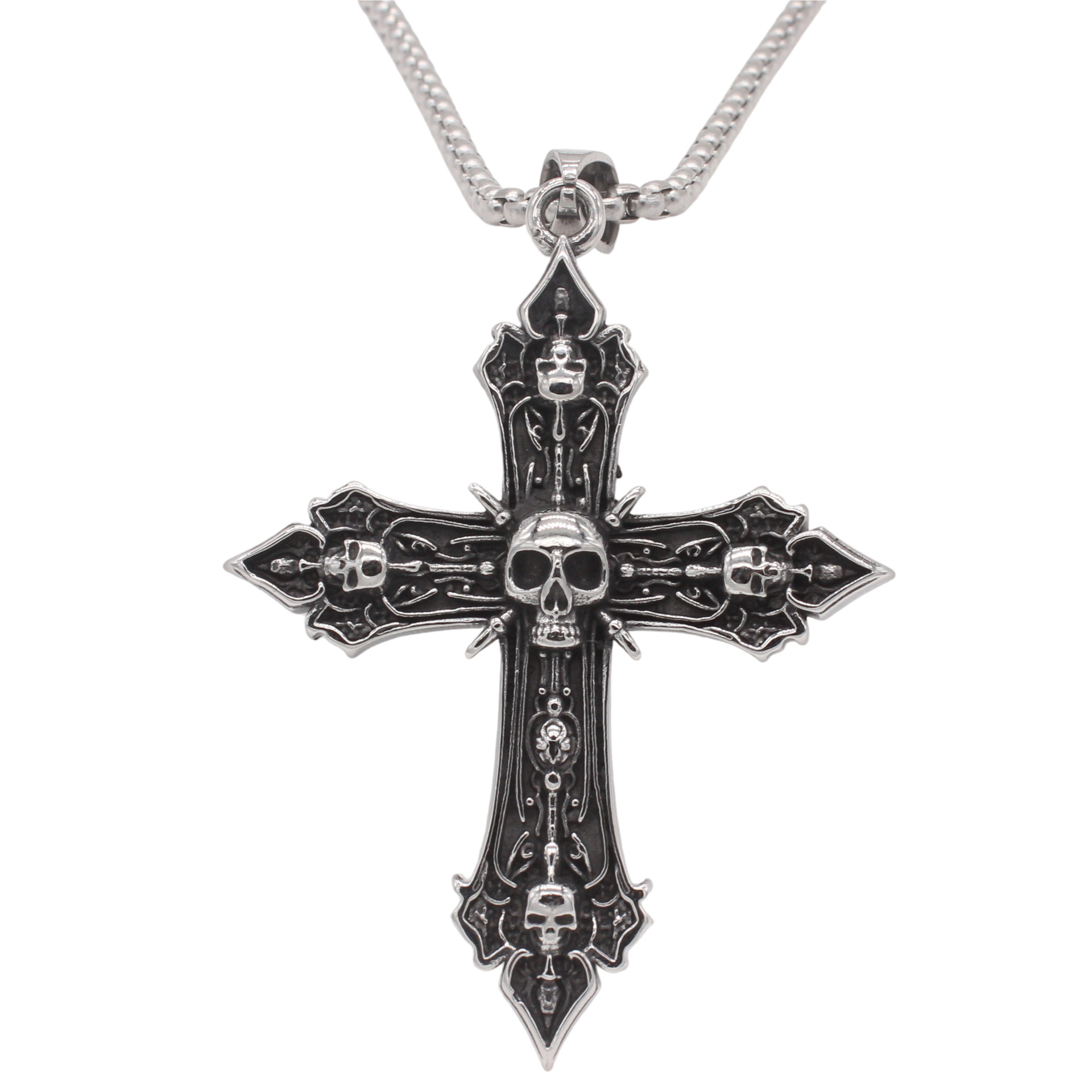 A sculpted cross anchored by skull accents, blending gothic imagery with a structured, vintage metal form.